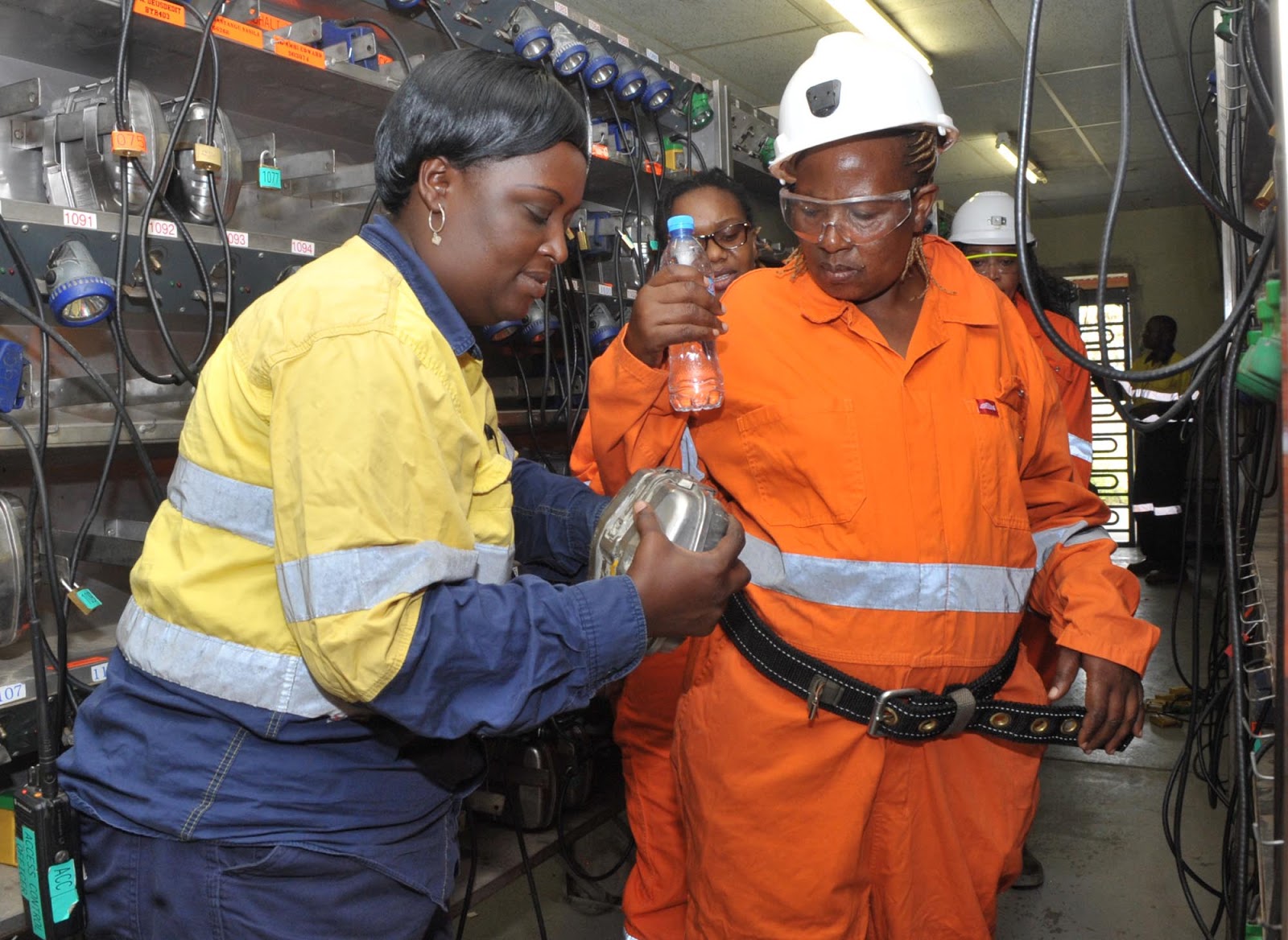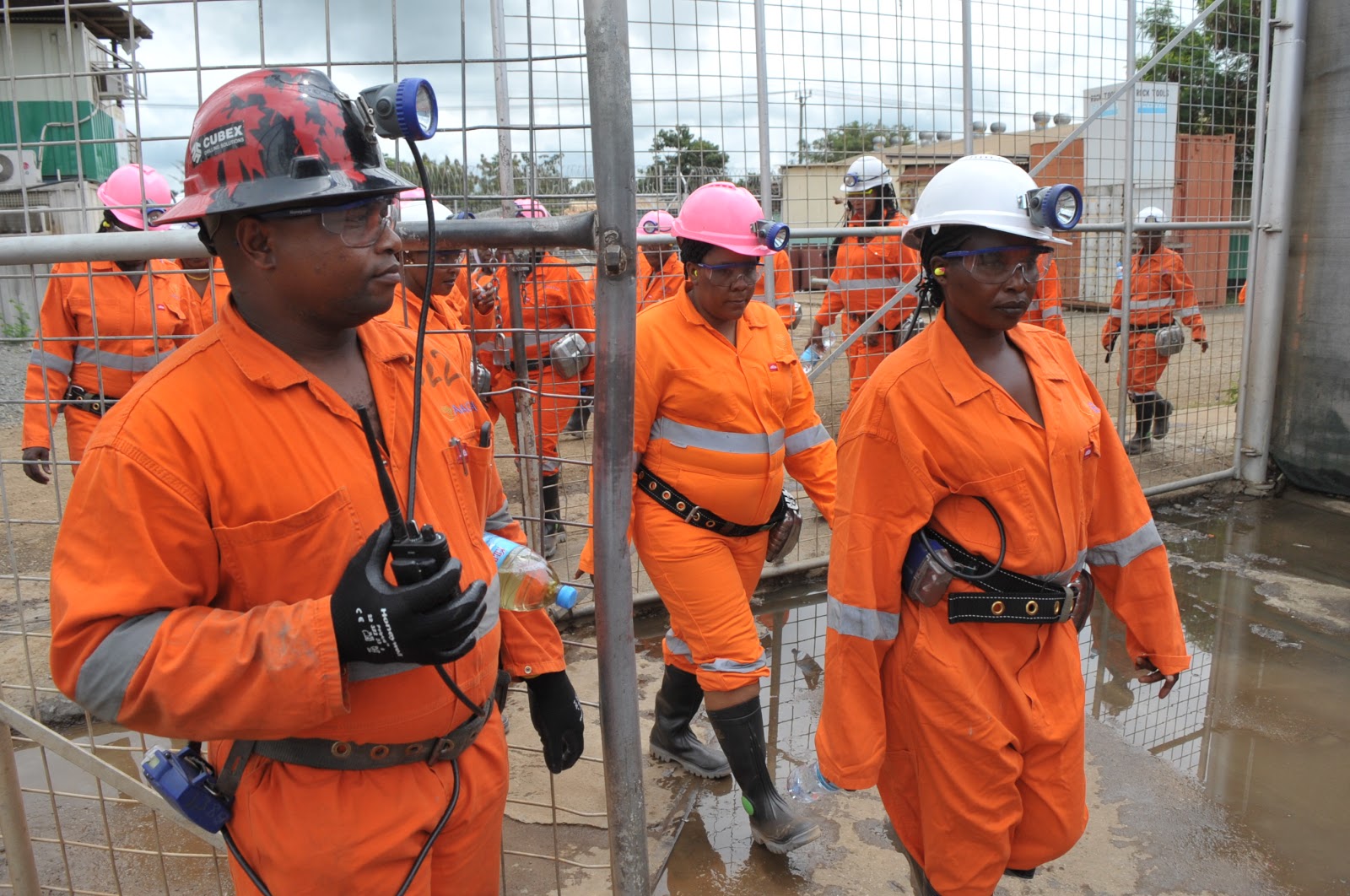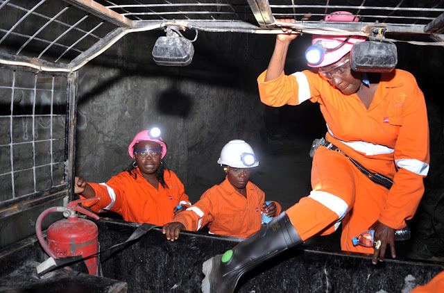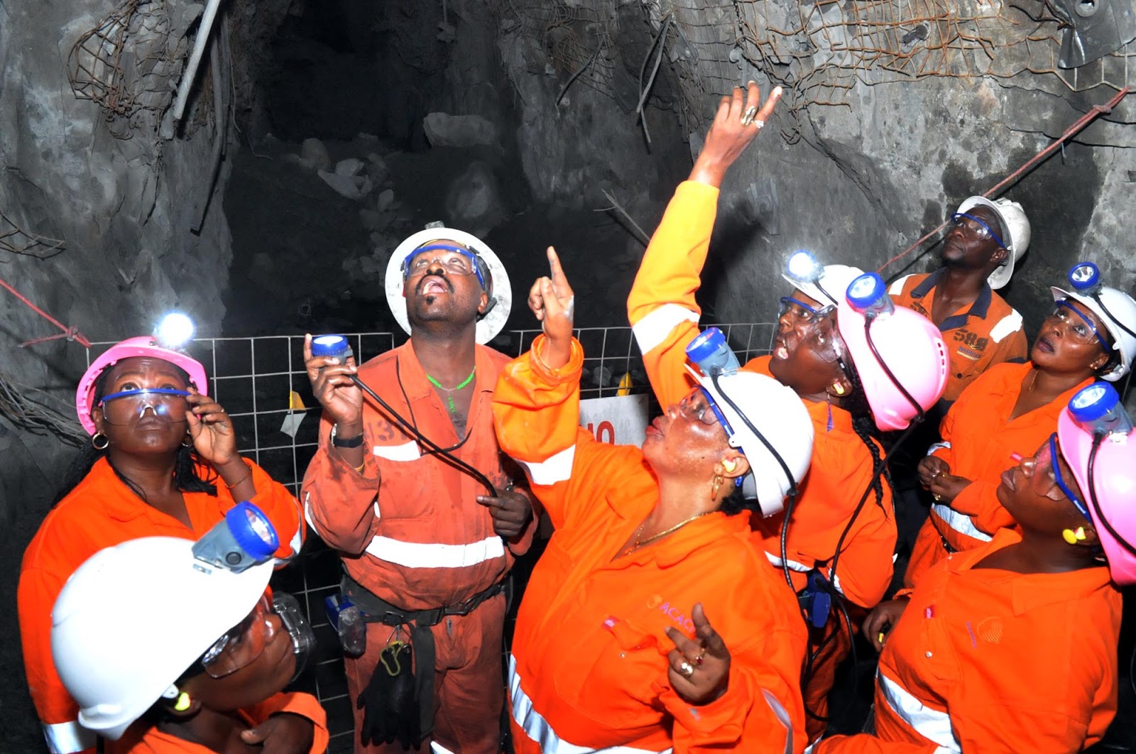 Baadhi ya akina mama wakiwa chini ya ardhi umbali wa kilomita 2 kuona kazi ya uchimbaji madini inavyofanywa.