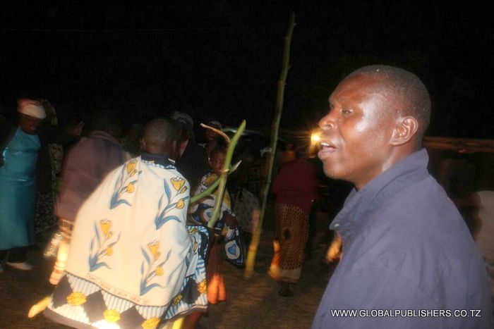 Kiongozi wa kijiji akipuliza pembe kama njia ya jadi ya mawasiliano kuwajulisha waombolezaji wengine kuwa tayari mwili wa marehemu Makongoro umewasili nyumbani hapo.
