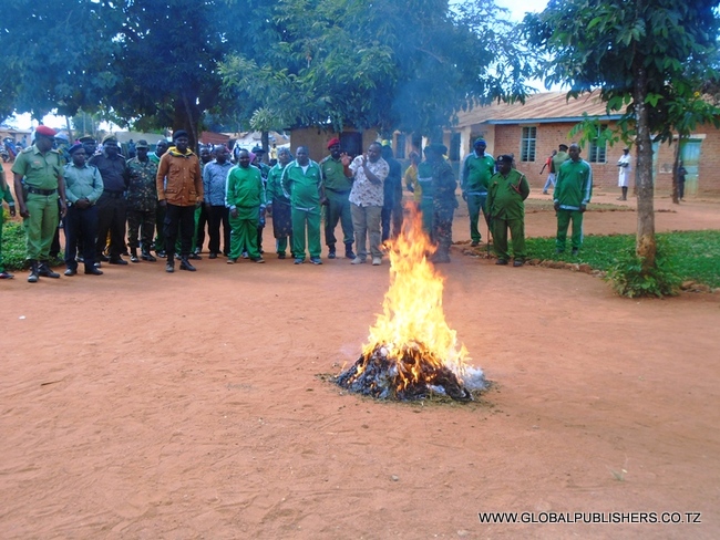 RUVUMA: Vita imepamba moto! Kiongozi wa Mbio za Mwenge wa Uhuru Mwaka 2016, George Mbijima akiwa na Kamati ya Ulinzi na Usalama ya Wilaya ya Songea wameteketeza madawa ya kulevya ‘unga’ kwenye Viwanja vya Shule ya Msingi Mloweka mjini Songea (pichani)yaliyokamatwa na polisi katika manispaa hiyo, mwaka huu, tembea na Amani.