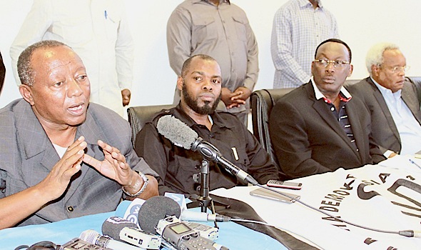 From left, Former Prime Minister Fredrick Sumaye speaks during a press conference in Mwanza yesterday, about a move by Police banned from paying their last respects to Chadema Geita region chairman the late Alphonce Mawazo. Zanzibar Party’s Vice Chairman, Said Issa Mohamed, National Chairman, Freeman Mbowe, and October general election Party’s candidate, Edward Lowassa. PHOTO|MICHAEL JAMSON