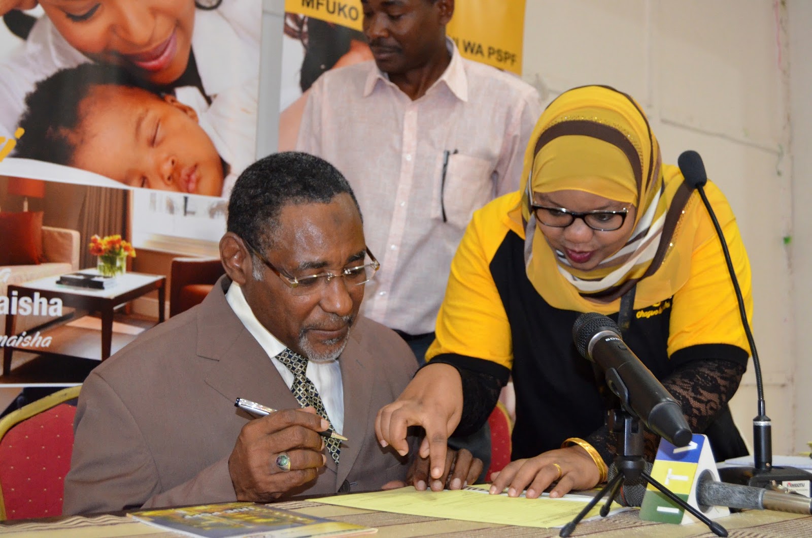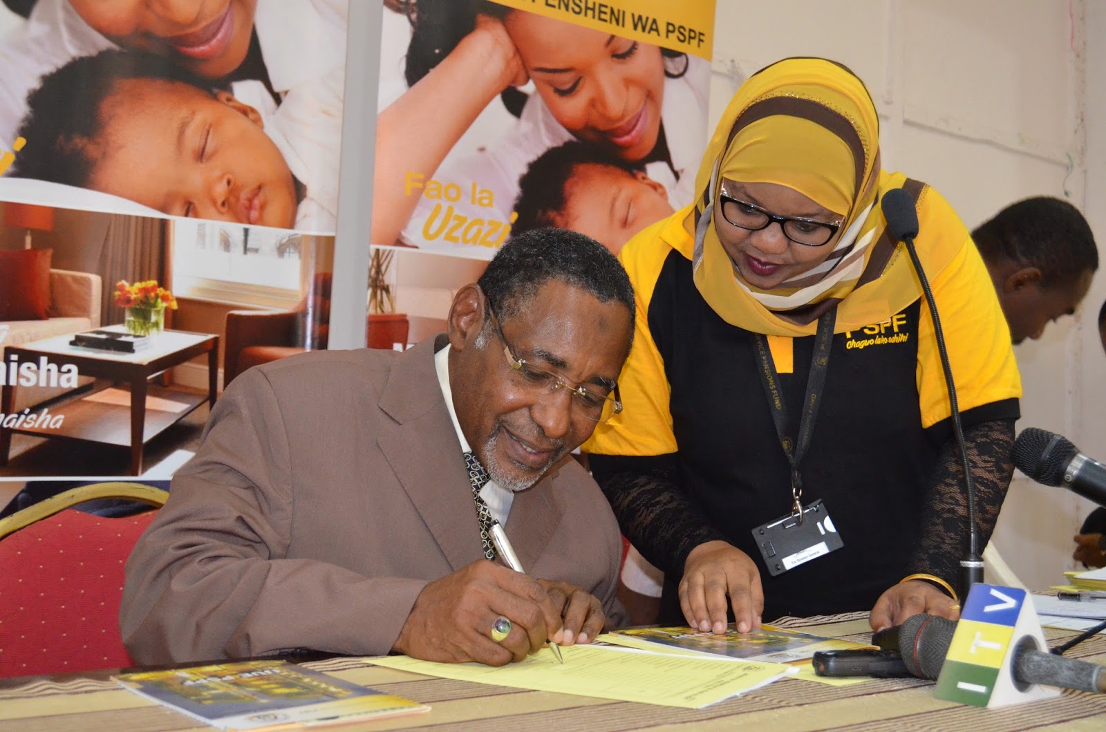 Mhe Hamad Rashid akijaza fomu ya Kuchangia kwa Hiari Mfuko wa PSPF baada ya kuufungua Mkutano huo na Wavuvi.