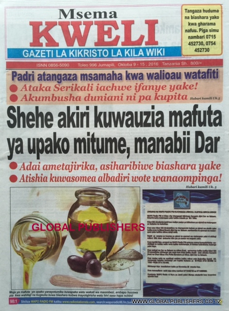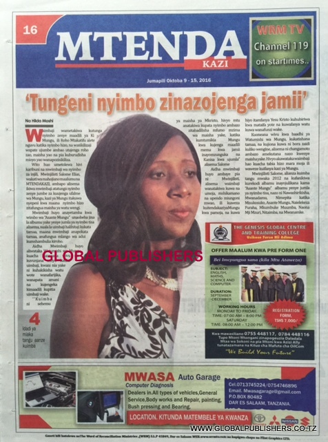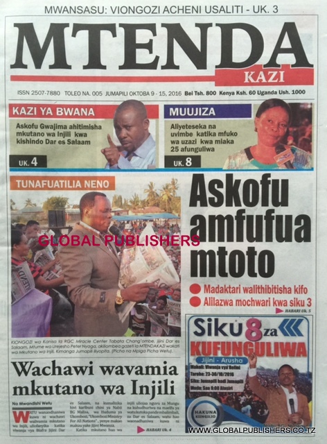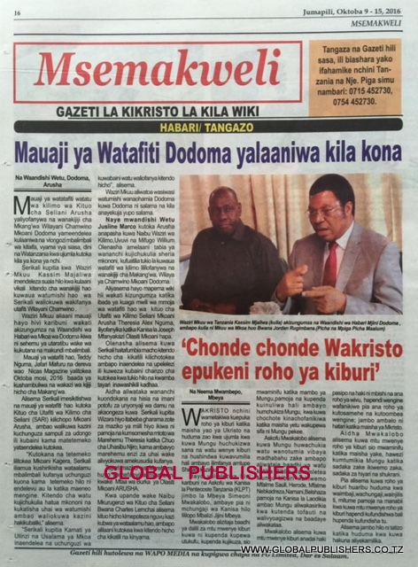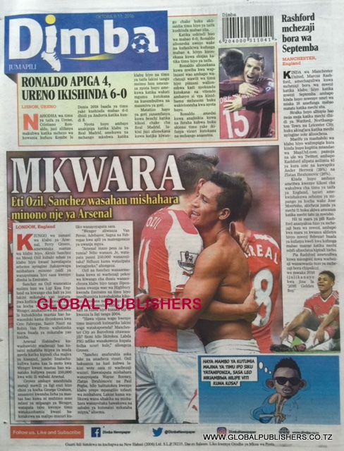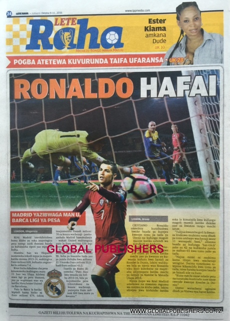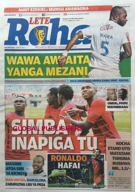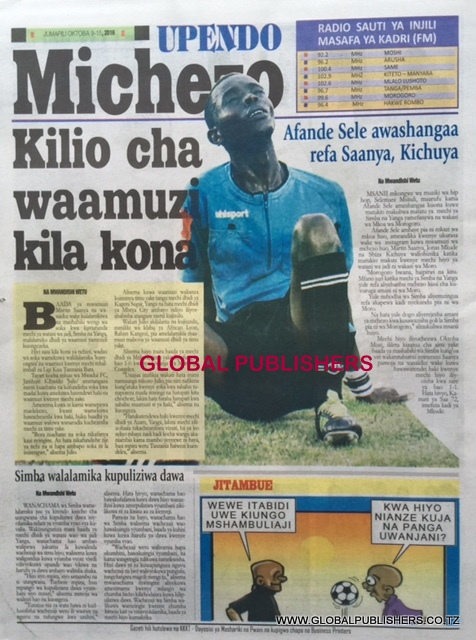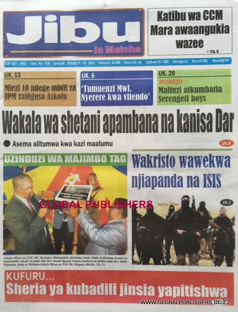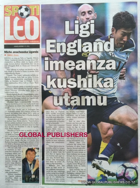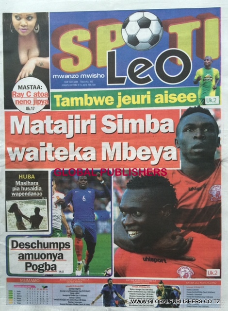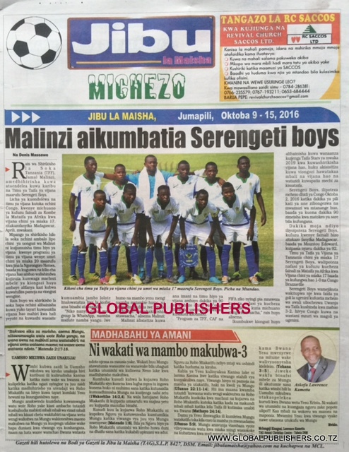 Magazeti Ya Tanzania Leo Oktoba 9, 2016 Global Publishers October 9, 2016 SHARE THIS: MAGAZETI ya leo Oktoba, 9 2016 stori zote kubwa zilizobebwa kwenye Magazeti ya Tanzania kwenye kurasa za mbele na nyuma ili ujue kinachoendelea msomaji wetu na endelea kuwa nasi hapa. SHARE THIS: