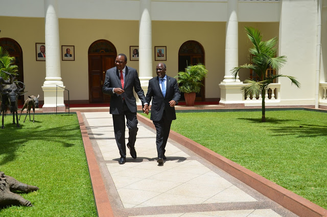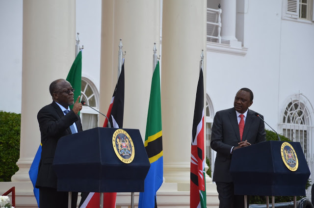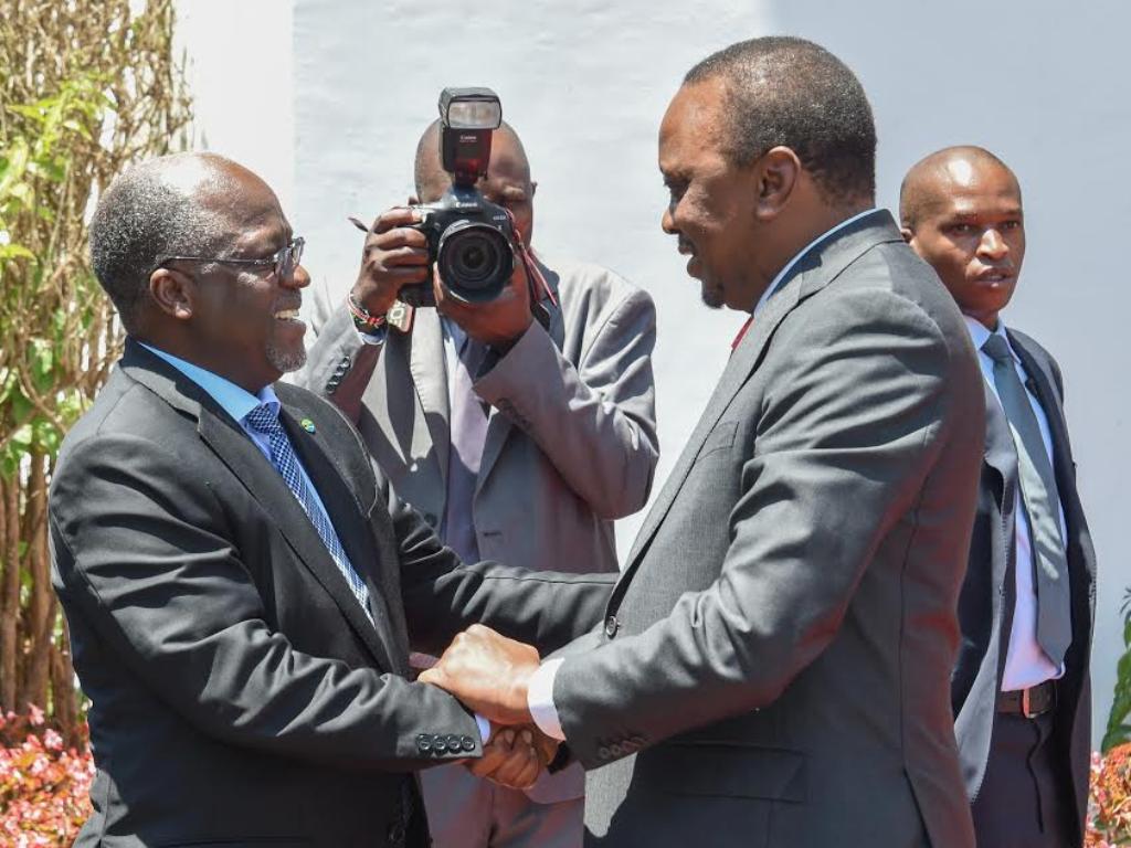 Rais wa Kenya, Uhuru Kenyatta (kulia) akisalimiana na Magufuli.