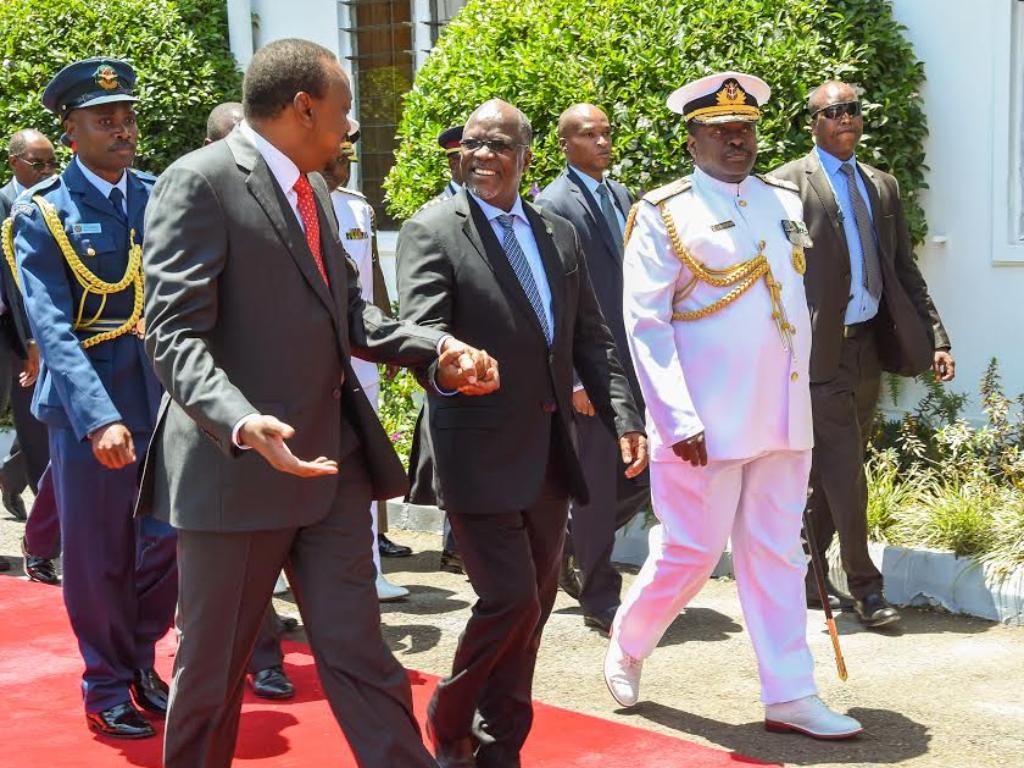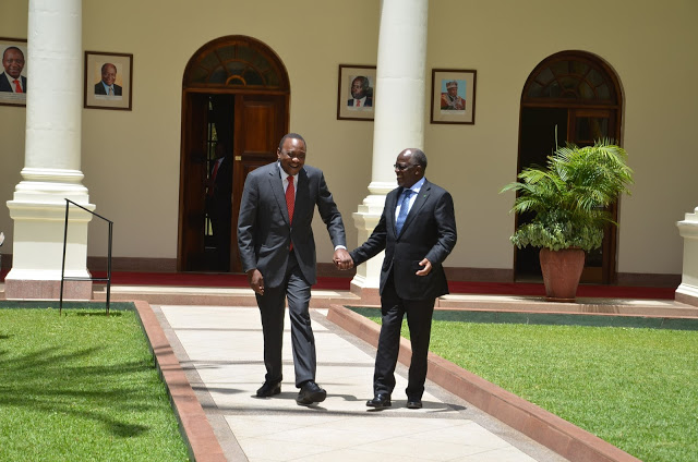 Uhuru Kenyatta akimtembeza Magufuli ndani ya Ikulu ya Kenya.