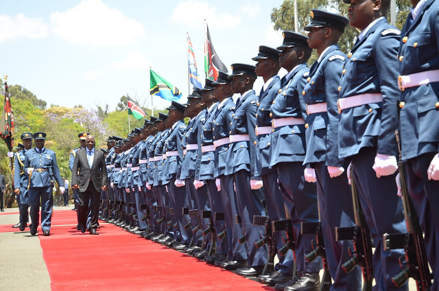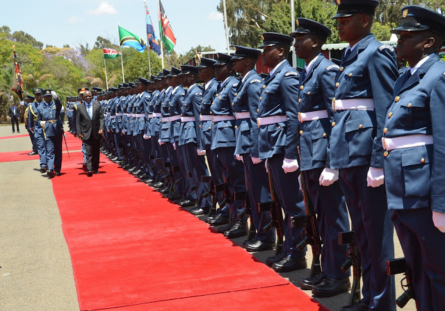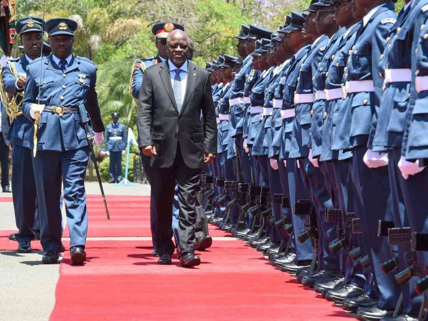 Rais wa Jamhuri ya Muungano wa Tanzania, Dkt John Pombe Magufuli akikagua gwaride, Ikulu Nairobi, Kenya.