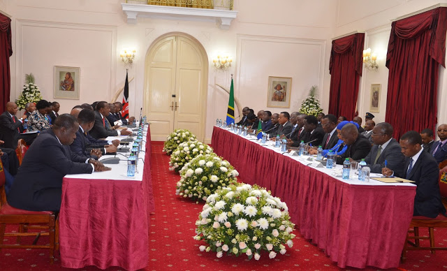 Rais wa Jamhuri ya Muungano wa Tanzania Dkt. John Pombe Magufuli akiwa pamoja na ujumbe wake katika mazungumzo na Rais wa Kenya Uhuru Kenyatta pamoja na ujumbe wake katika Ikulu ya Nairobi.