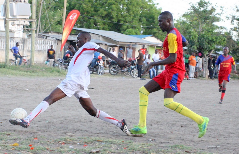 Beki wa timu ya soka ya veterani Mango Garden, Hamis Ramadhani (kulia ) akimdhibiti mshambuliaji, Nicolaus Benedict, kwenye pambano la kirafiki la Mziki mnene lililodhaminiwa na Vodacom Tanzania kwenye viwanja vya Mango Garden, Kinondoni jijini Dar es Salaam leo.
