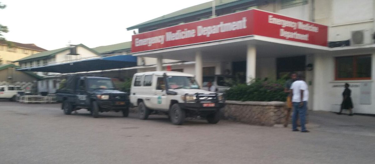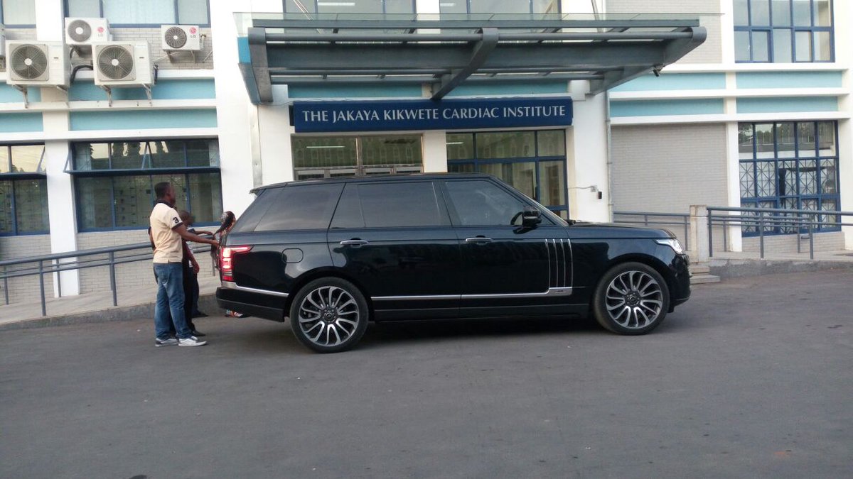 Gari la wagonjwa lililombeba Yusuf Manji na gari lake binafsi yakiwa katika viunga vya Taasisi ya Moyo ya Jakaya Kikwete (JKCI).