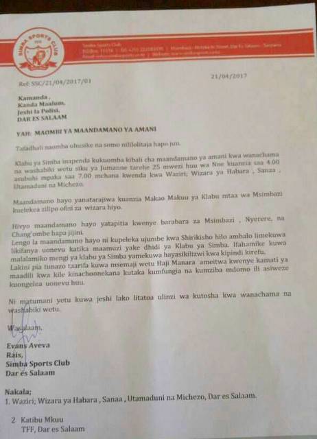 Katika barua hiyo Aveva ameeleza kuwa wanaomba maandamano hayo yatakayohusisha wanachama wote wa Simba, yaanzie makao makuu ya klabu hiyo Mtaa wa Msimbazi hadi Wizara ya Habari.