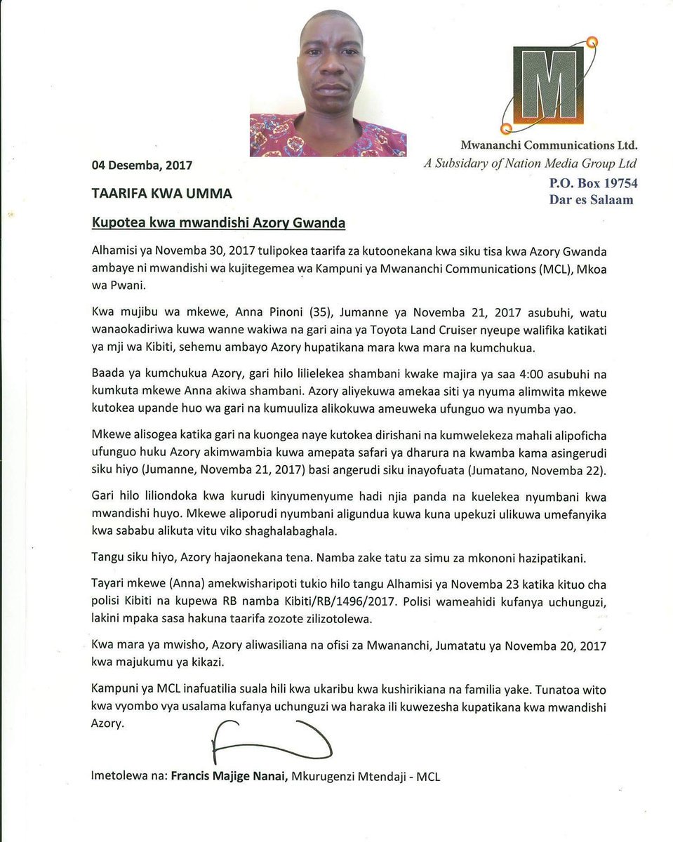Mwandishi wa Habari wa Mwananchi, Azory Gwanda anadaiwa kupotea baada ya kuchukuliwa na watu ambao hawajajulikana tangu Novemba 21 mwka huu na hajulikani alipo mpaka sasa.