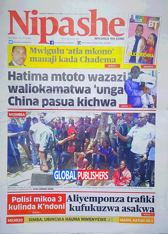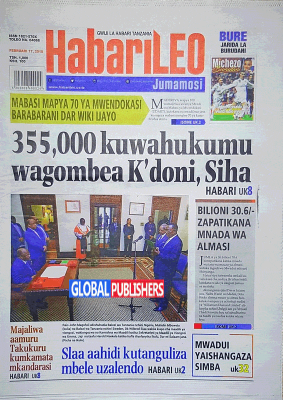 MAGAZETI YA TANZANIA LEO JUMAMOSI, FEB 17, 2018 Global Publishers February 17, 2018 SHARE THIS: Hapa tumekuanikia kurasa za mbele na za nyuma za magazeti yote ya Tanzania leo, Feb 17, 2018. Ni yale ya Hardnews, Udaku na Michezo. Usipitwe na Matukio, Install App Yako ya Kijanja na Namba Moja Tanzania ya Global Publishers Android ===>GooglePlay iOS ===>AppStore SHARE THIS:
