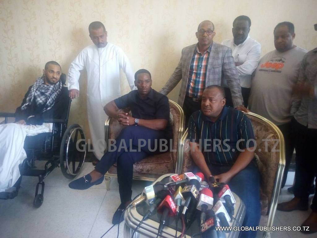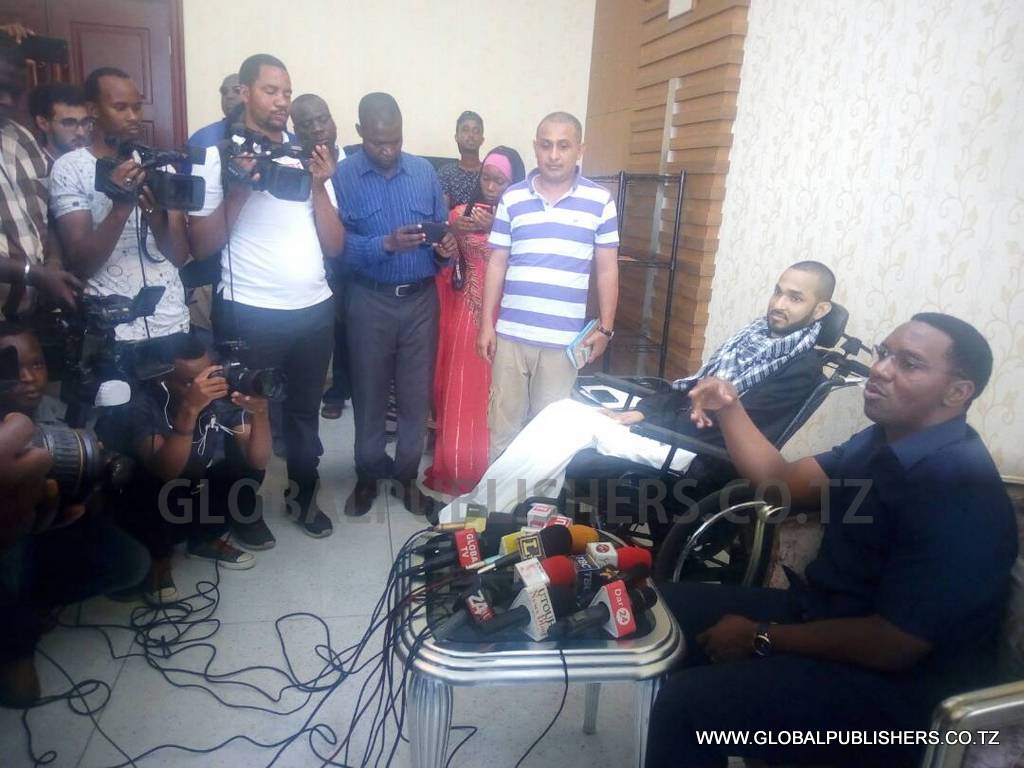 Mkuu wa Mkoa wa Dar es Salaam, Paul Makonda (kulia) akiongea na waandishi wa habari uwanja wa ndege jijini Dar es Salaam leo wakati wa kumuaga Ahmedy Albaity (wa pili kulia) aliyeondoka kwenda kutibiwa China tatizo la uti wa mgongo ambalo limemsumbua kwa miaka mingi.…Akisisitiza jambo.Mmoja wa wadau (kulia) waliomsaidia Albaity katika matibabu yake akiongea wakati wa kumuaga.