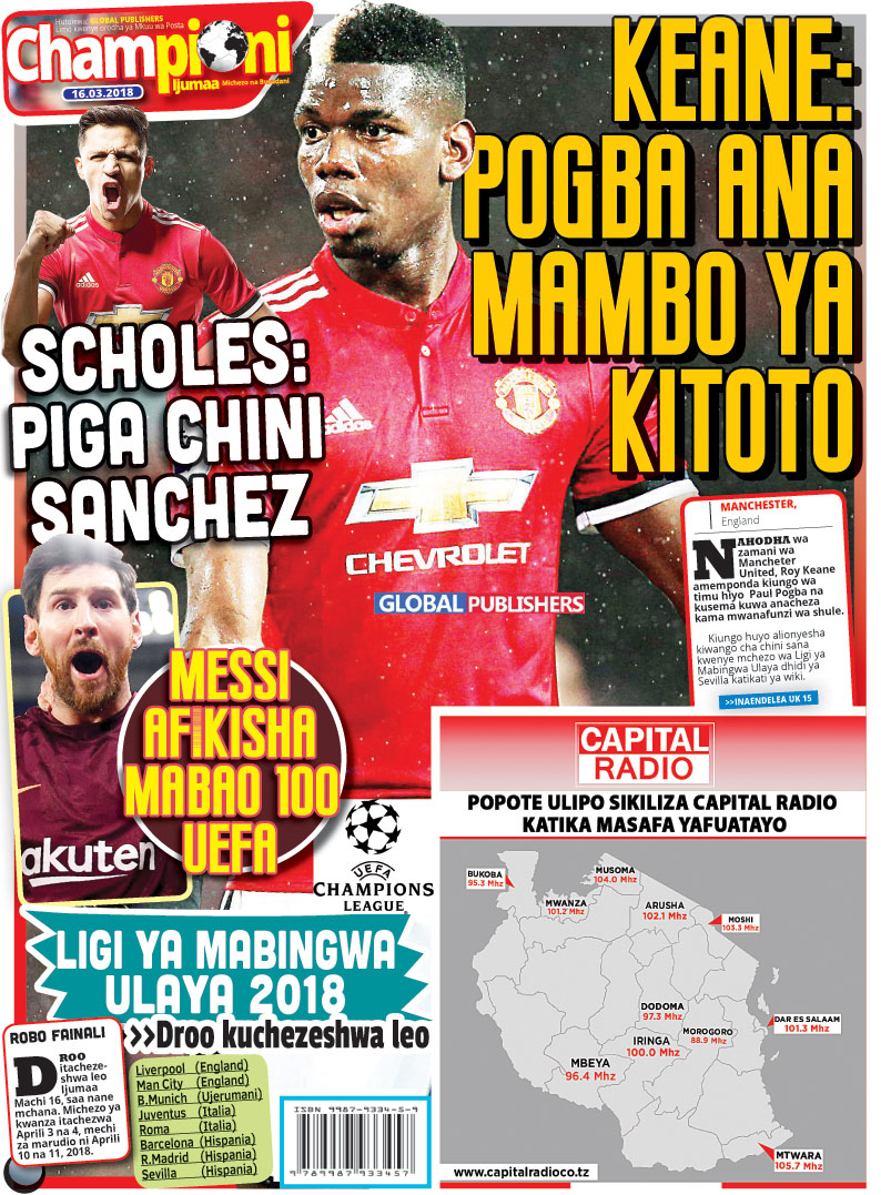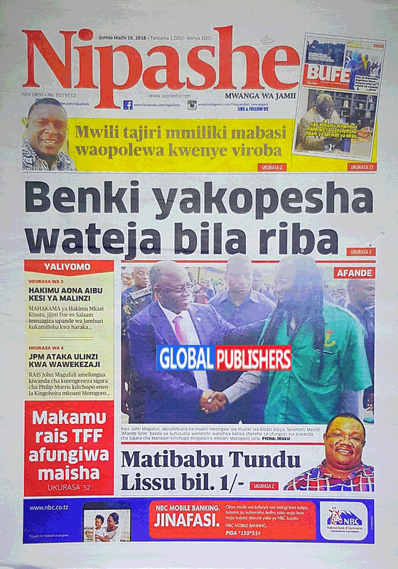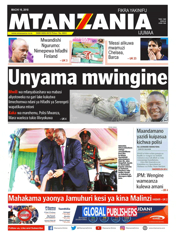 MAGAZETI YA TANZANIA LEO IJUMAA, MACHI 16, 2018 Global Publishers March 16, 2018 SHARE THIS: Hapa tumekuanikia kurasa za mbele na za nyuma za magazeti yote ya Tanzania leo, Machi 16, 2018. Ni yale ya Hardnews, Udaku na Michezo. Usipitwe na Matukio, Install App Yako ya Kijanja na Namba Moja Tanzania ya Global Publishers Android ===>GooglePlay iOS ===>AppStore SHARE THIS: