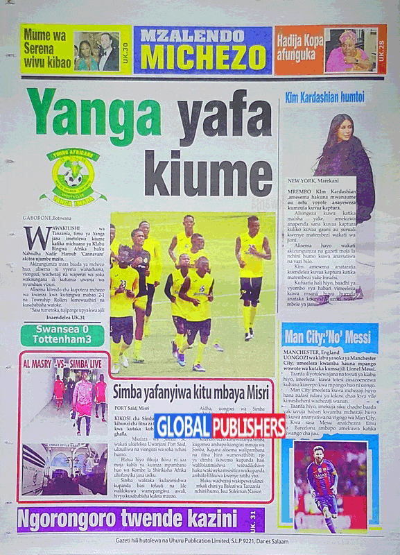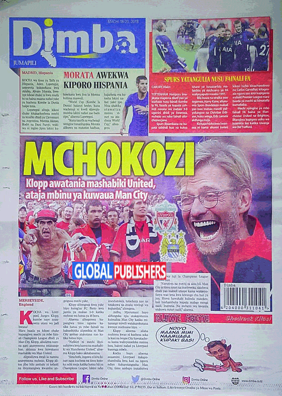 MAGAZETI YA TANZANIA LEO JUMAPILI, MACHI 18, 2018 Global Publishers March 18, 2018 SHARE THIS: Hapa tumekuanikia kurasa za mbele na za nyuma za magazeti yote ya Tanzania leo, Machi 18, 2018. Ni yale ya Hardnews, Udaku na Michezo. Usipitwe na Matukio, Install App Yako ya Kijanja na Namba Moja Tanzania ya Global Publishers Android ===>GooglePlay iOS ===>AppStore SHARE THIS: