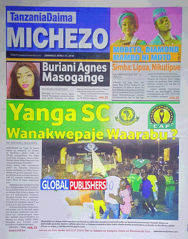 MAGAZETI YA TANZANIA LEO JUMAMOSI, APRILI 21, 2018 Global Publishers April 21, 2018 SHARE THIS: Hapa tumekuanikia kurasa za mbele na za nyuma za magazeti yote ya Tanzania leo, Aprili 21, 2018. Ni yale ya Hardnews, Udaku na Michezo. Usipitwe na Matukio, Install App Yako ya Kijanja na Namba Moja Tanzania ya Global Publishers Android ===>GooglePlay iOS ===>AppStore SHARE THIS: