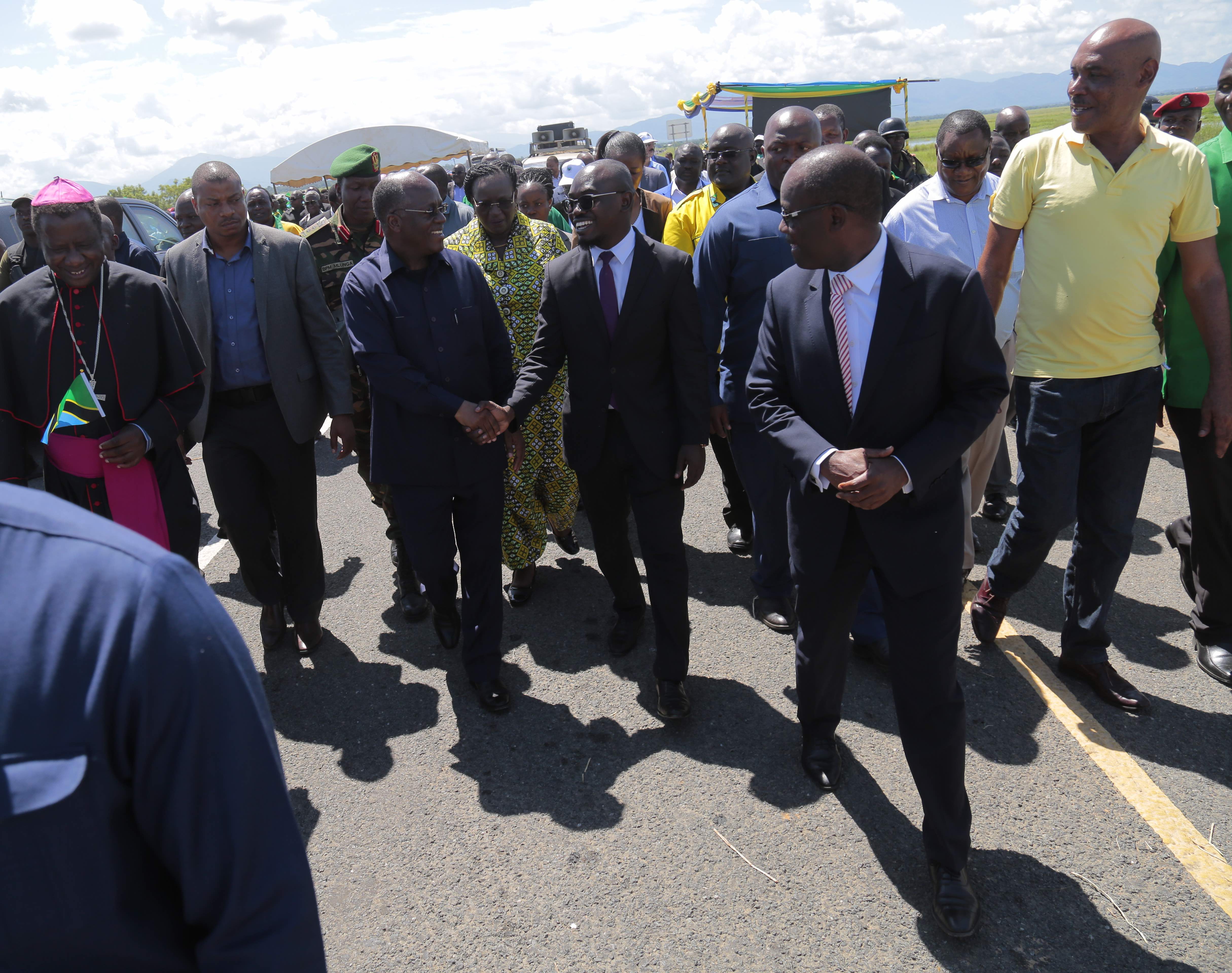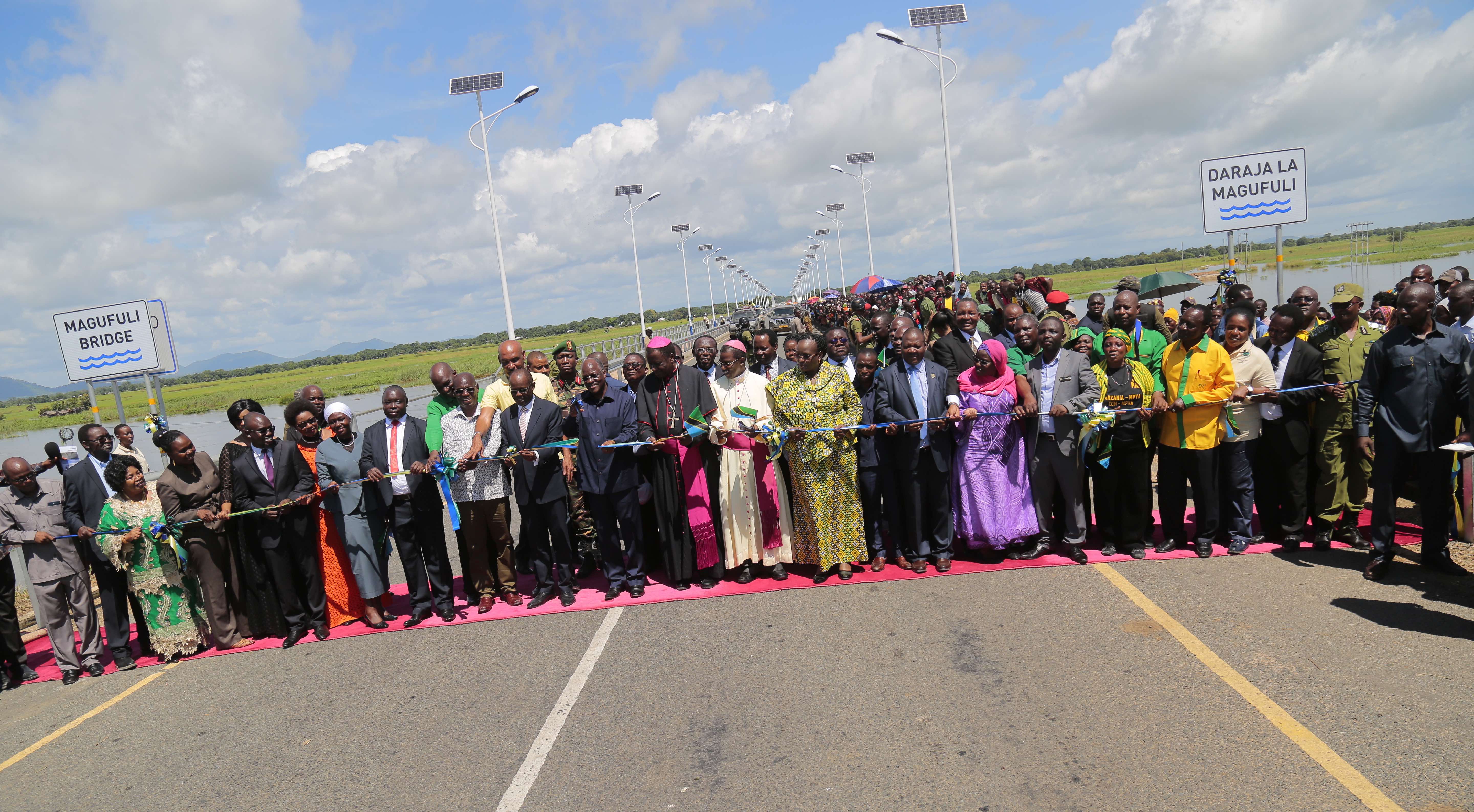 Rais  Magufuli akiwa na Waziri wa Ujenzi, Uchukuzi na Mawasiliano Profesa Makame Mbarawa, Mkewe Mama Janeth Magufuli, Viongozi mbalimbali wa Dini, Serikali, Wabunge wa mkoa wa Morogoro na Viongozi wengine, akikata utepe kuashiria ufunguzi wa Daraja kubwa la Magufuli lenye urefu wa mita 384 linalopita katika mto Kilombero mkoani Morogoro.