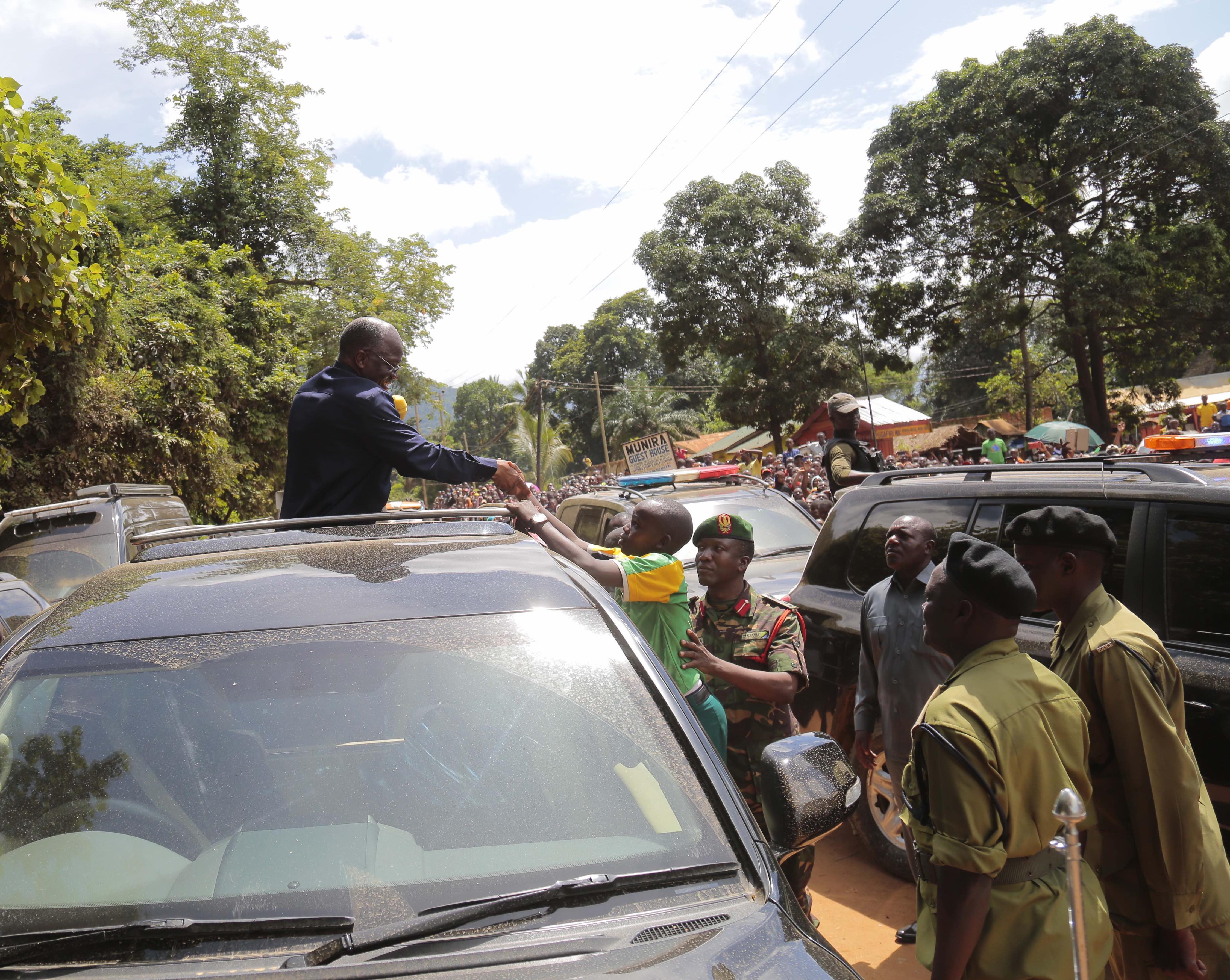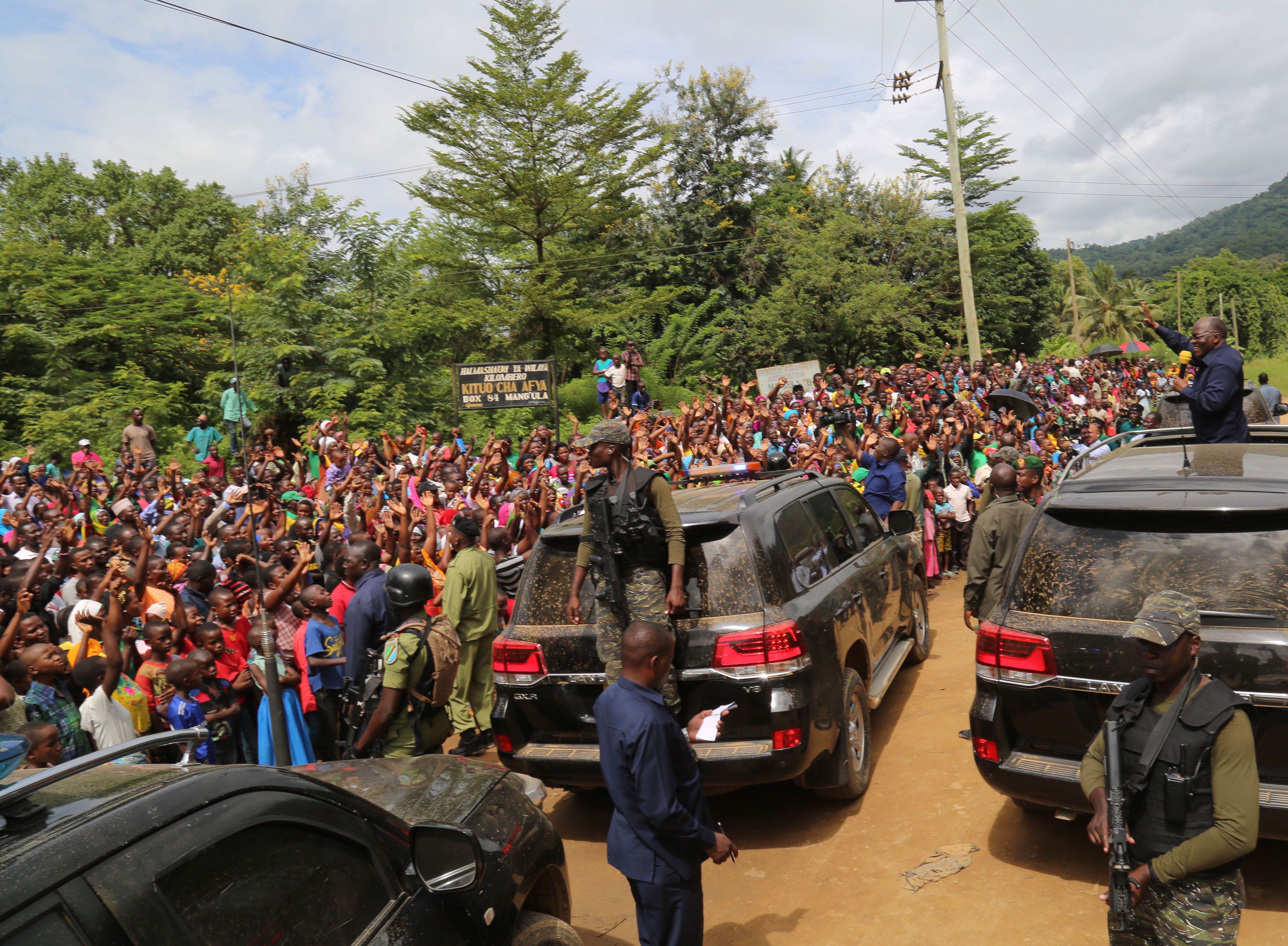 Rais  Magufuli akizungumza na wananchi wa Mang’ula kona katika Wilaya ya Kilombero wakati akiwa njiani kuelekea kufungua Daraja kubwa linalopita katika mto Kilombero (Daraja la Magufuli lenye urefu wa M384) lililopo katika Wilaya ya Kilombero mkoani Morogoro.