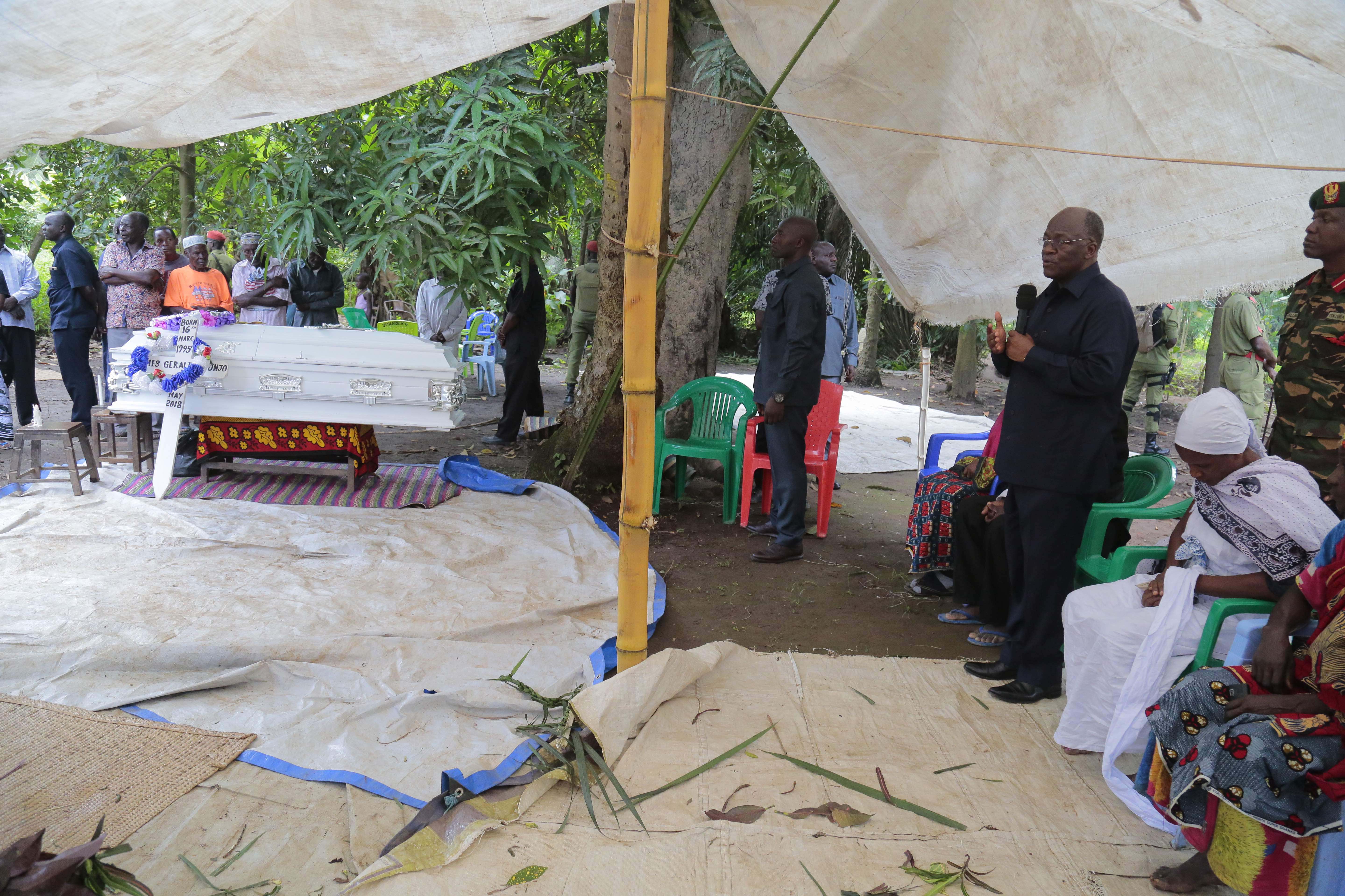 Rais Magufuli akizungumza katika msiba wa mwanafunzi wa Chuo cha Ardhi, James Gerald mara baada ya kutoa rambirambi wakati akiwa njiani kuelekea kufungua Daraja kubwa linalopita katika mto Kilombero (Daraja la Magufuli) lililopo katika Wilaya ya Kilombero mkoani Morogoro.