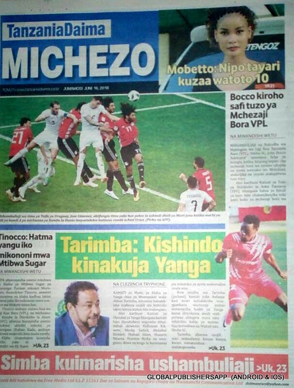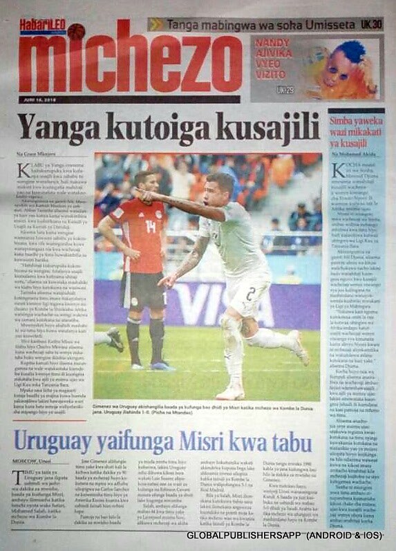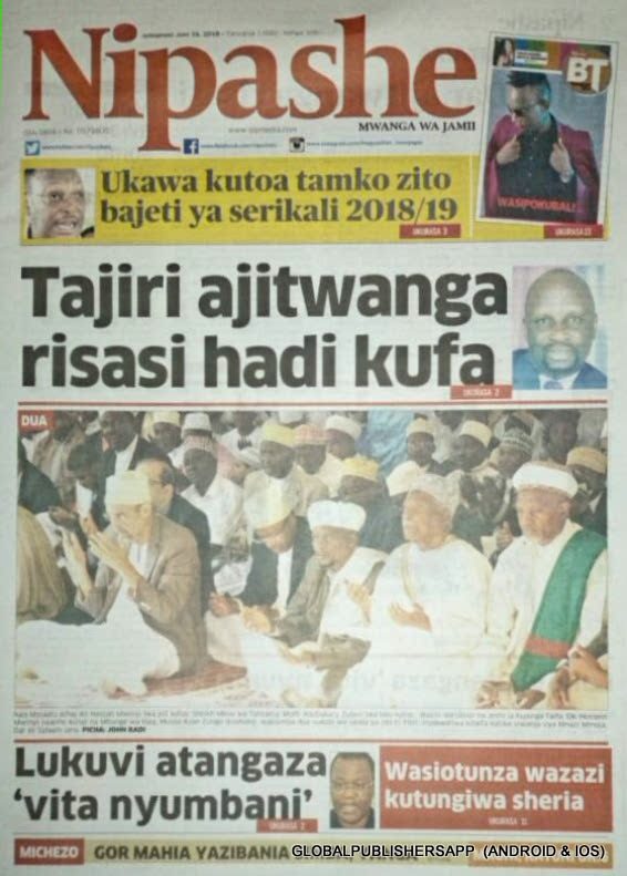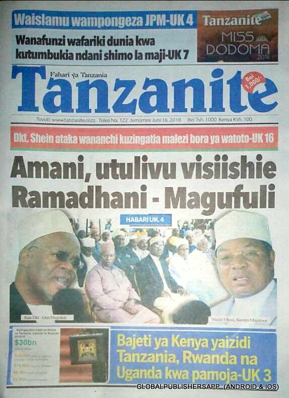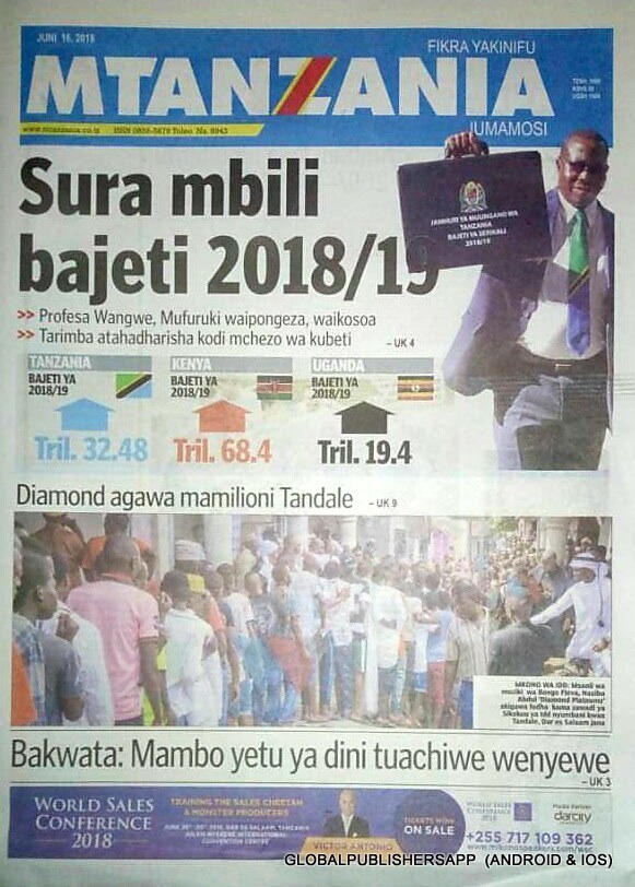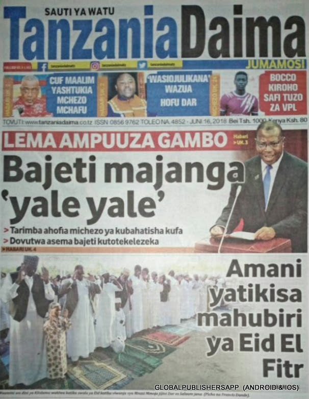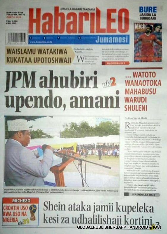 MAGAZETI YA TANZANIA LEO JUMAMOSI, JUNI 16, 2018 Global Publishers June 16, 2018 SHARE THIS: Hapa tumekuanikia kurasa za mbele na za nyuma za magazeti yote ya Tanzania leo, Juni 16, 2018. Ni yale ya Hardnews, Udaku na Michezo. Usipitwe na Matukio, Install App Yako ya Kijanja na Namba Moja Tanzania ya Global Publishers Android ===>GooglePlay iOS ===>AppStore SHARE THIS: