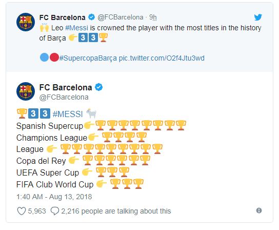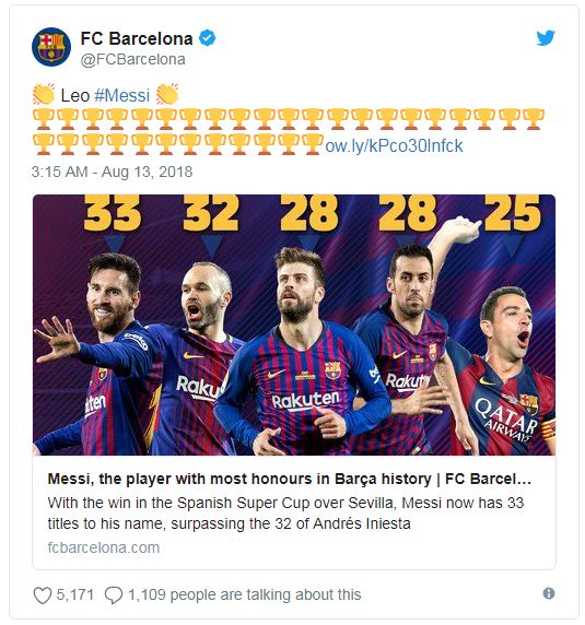 Katika mchezo huo, ikiwa ni game yake ya kwanza tangu akabidhiwe unahodha wa Barcelona kutoka kwa Andres Iniesta, Lionel Messi ameweka rekodi yake ya kutwaa mataji mengi zaidi ndani ya timu hiyo kuliko mchezaji yeyote mara baada ya kufikisha idadi ya makombe 33.
