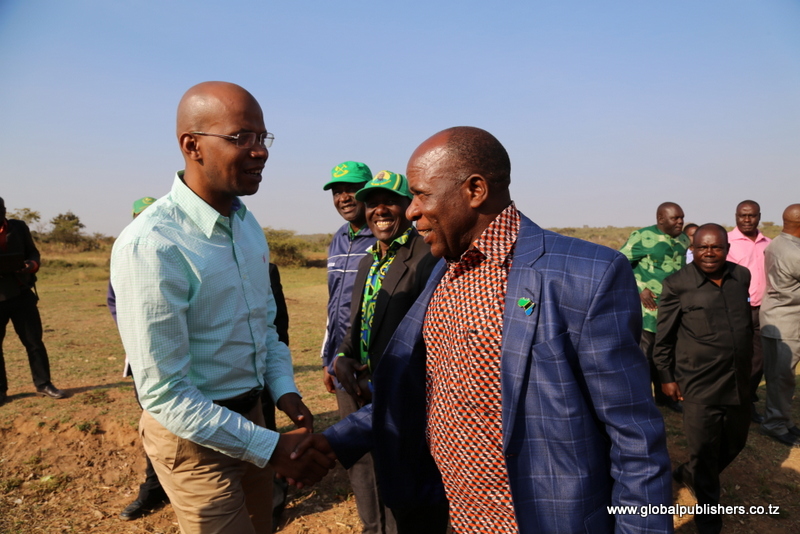 Waziri wa Nchi Ofisi ya Makamu wa Rais Muungano na Mazingira Mhe. January Makamba (kushoto) akisalimiana na Mkuu wa Wilaya ya Iramba Mhe. Emmanuel Luhahula mara baada ya kuwasili Wilayani hapo kwa ziara ya kikazi. Waziri Makamba ametembelea bwawa la Urughu na Ziwa Kitangiri ikiwa ni miongoni mwa maeneo yaliyopendekezwa kuwa maeneo lindwa kimazingira.