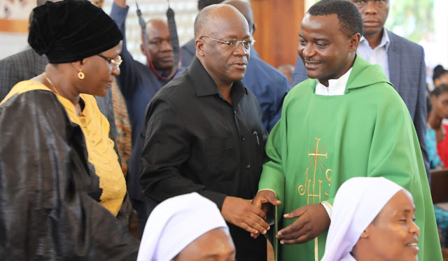 Rais John Magufuli akiwa na mkewe, Janeth (katikati) na mke wa waziri mkuu, Mary Majaliwa, walipokuwa wakisali katika Kanisa la Mtakatifu Petro, Parokia ya Oyster Bay, Dar es Salaam leo Septemba 23,2018.