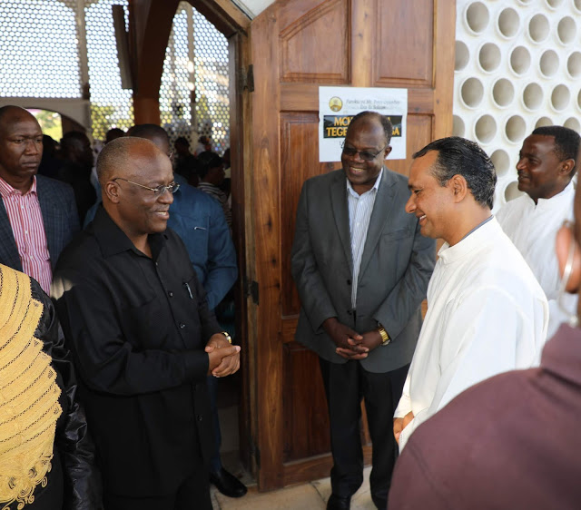 Magufuli akizungumza na Paroko Msaidizi Padre Asis Mendonca.
