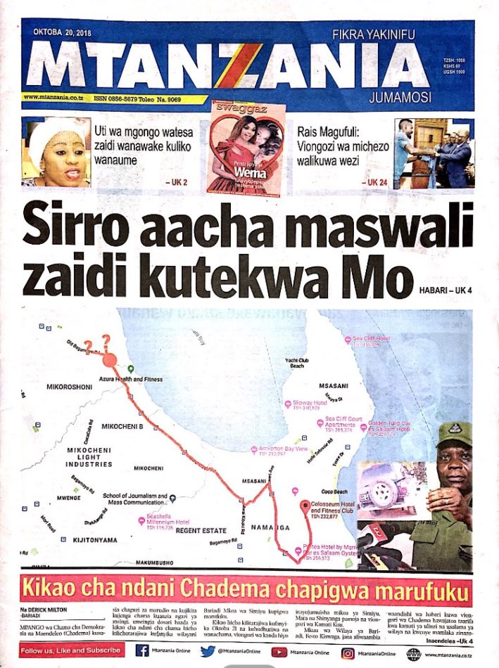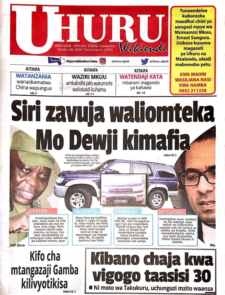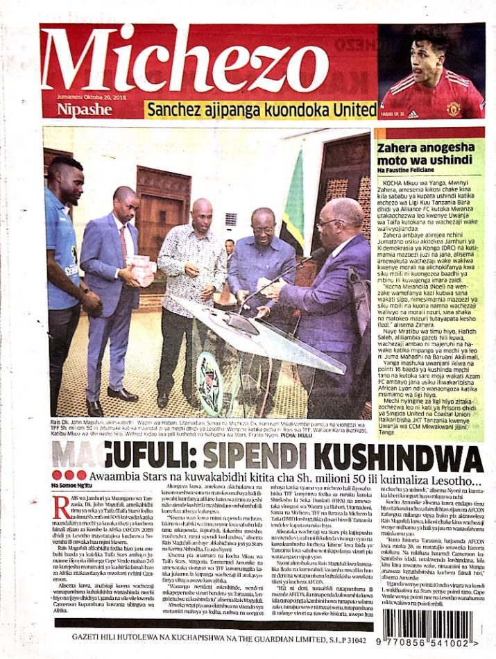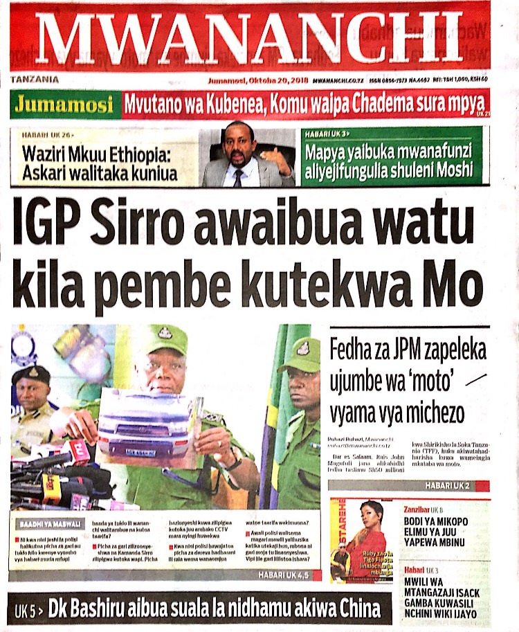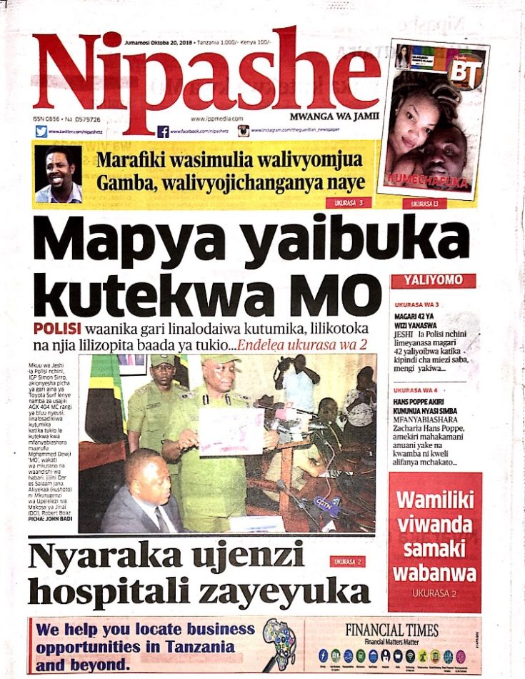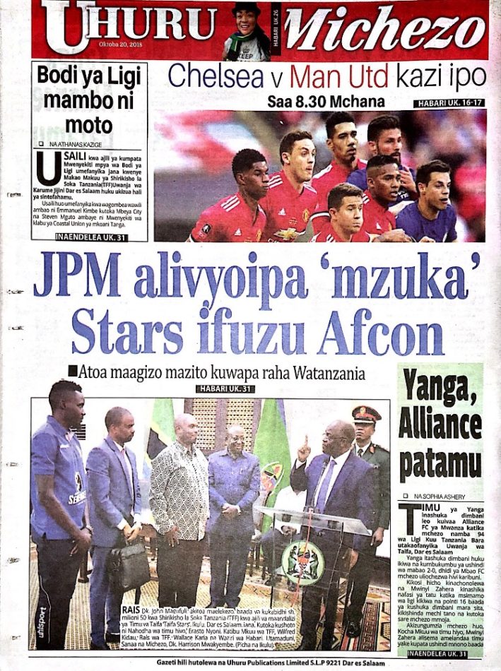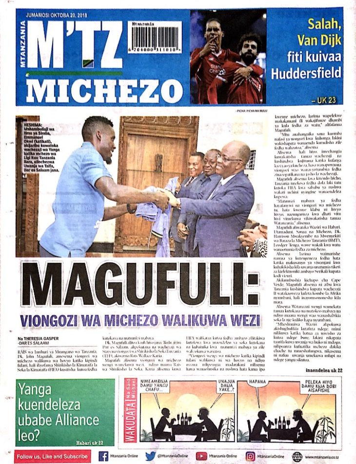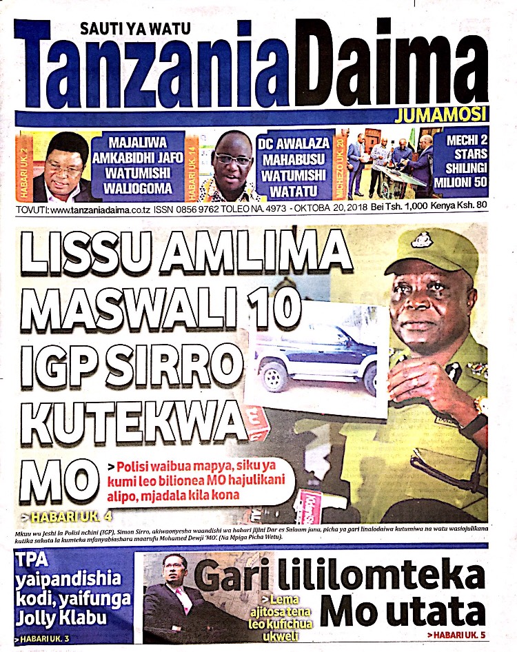 Hapa tumekuanikia kurasa za mbele na za nyuma za magazeti yote ya Tanzania leo Oktoba 20, 2018. Ni yale ya Hardnews, Udaku na Michezo.