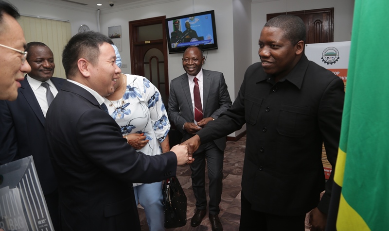 Mkurugenzi Mtendaji wa Kampuni ya Yinengda New Material Techonology Mayi Hong akisalimiana na Mkurugenzi Mtendaji wa kituo cha Uwekezaji (TIC),Geofrey Mwambe.