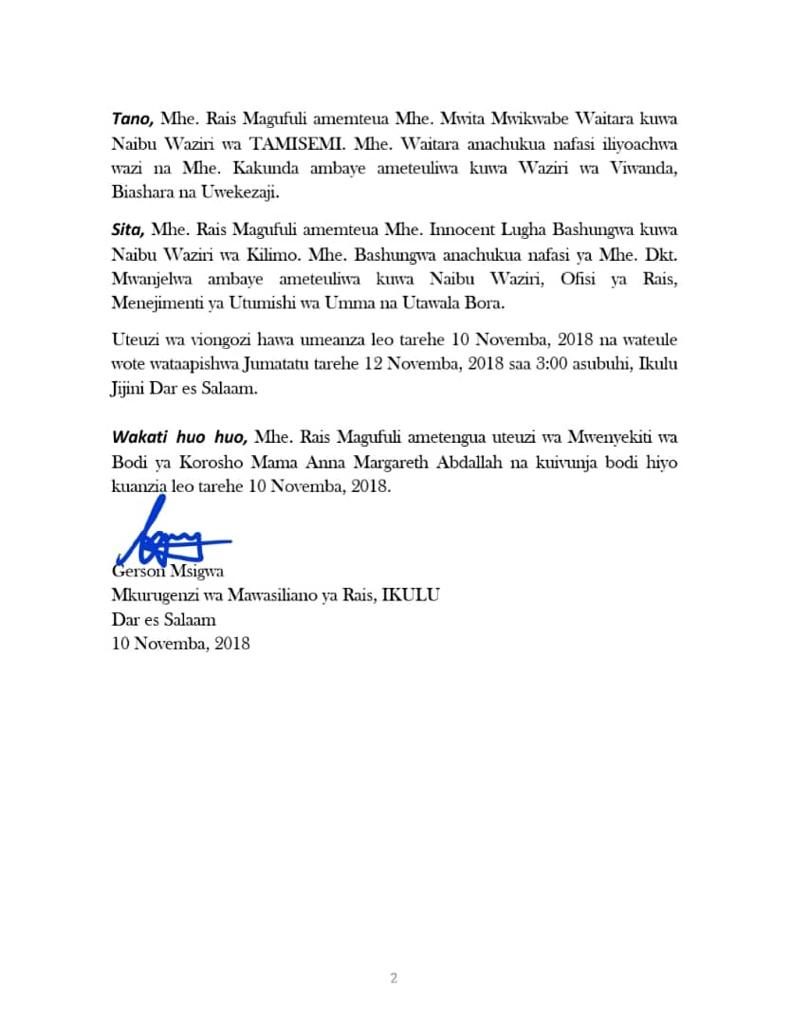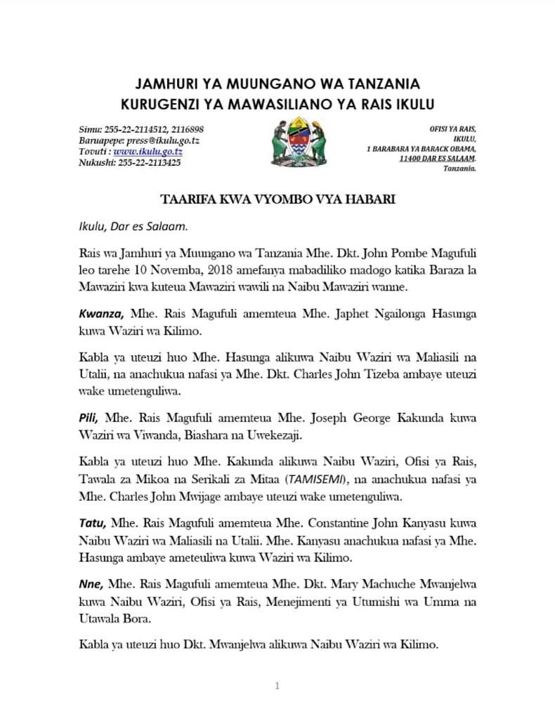 Rais Dkt. John Magufuli leo Jumamosi, Novemba 10, 2018 amefanya mabadiliko madogo ya Baraza lake la Mawaziri ambapo ametengua uteuzi wa aliyekuwa Waziri wa Kilimo, Dkt. Charles Tizeba, nafasi yake inachukuliwa na Japhet Hasunga.