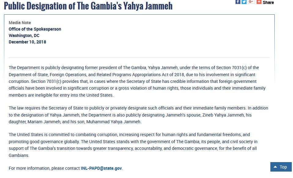 Marekani imeeleza kuwa Jammeh amezuiwa kuingia nchini humo pamoja na familia yake yote, na kwamba uamuzi huo unatokana na sheria za nchi hiyo kwa maafisa wa Serikali za nchi nyingine ambao wanaaminika kujihusisha na vitendo vya ufisadi na uvunjifu wa haki za binadamu.