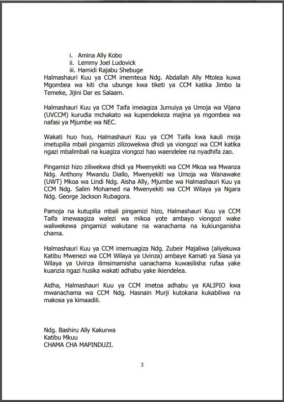 Kwa kauli moja Halmashauri Kuu ya CCM Taifa imepokea maombi na kukubali kusamehewa adhabu ya kufukuzwa uanachama kutoka kwa waliokuwa wana CCM wanne ambao walitenda makosa hayo wakiwa Wenyeviti wa CCM ngazi ya Mikoa na Wilaya.