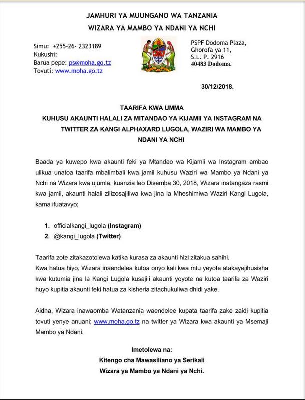 BAADA ya kuwepo kwa akaunti feki ya Mtandao wa Kijamii wa Instagram, ambao ulikuwa unatoa taarifa mbalimbali kwa jamii kuhusu Waziri wa Mambo ya Ndani ya Nchi na Wizara kwa ujumla, kuanzia leo Desemba 30, 2018, wizara hiyo imetangaza rasmi kwa jamii akaunti halali zilizosajiliwa kwa jina la Waziri Kangi Lugola kama ifuatavyo:-