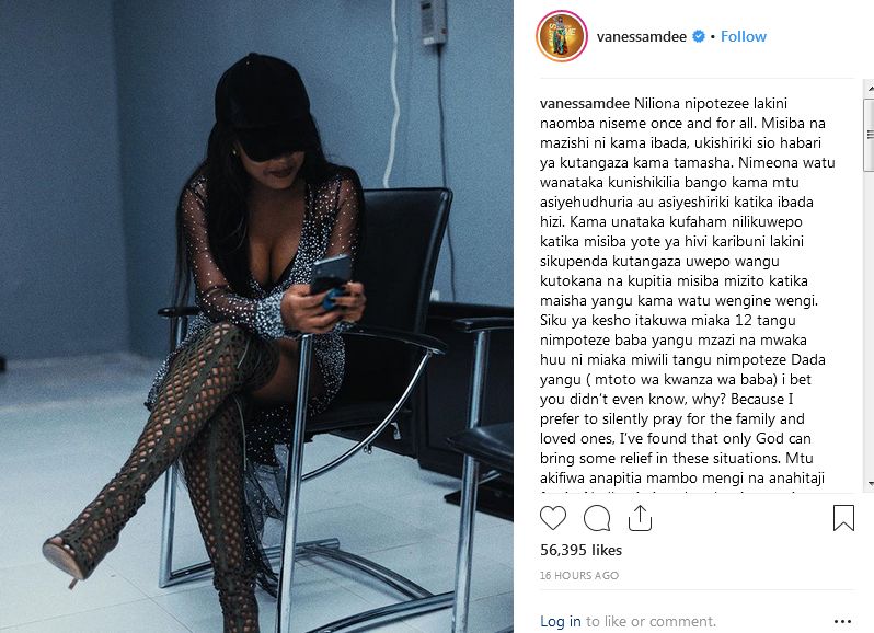 “Siku ya kesho itakuwa miaka 12 tangu nimpoteze baba yangu mzazi na mwaka huu ni miaka miwili tangu nimpoteze Dada yangu ( mtoto wa kwanza wa baba) i bet you didn’t even know, why? Because I prefer to silently pray for the family and loved ones, I’ve found that only God can bring some relief in these situations. “ameeleza Vanessa Mdee na kufafanua.