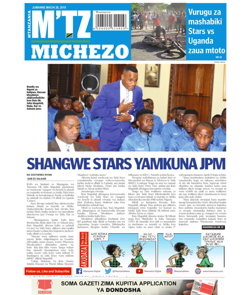 MAGAZETI YA TANZANIA LEO JUMANNE, MACHI 26, 2019 Global Publishers March 26, 2019 SHARE THIS: Hapa tumekuanikia kurasa za mbele na za nyuma za magazeti yote ya Tanzania leo MACHI 26, 2019. Ni yale ya Hardnews, Udaku na Michezo. Usipitwe na Matukio, Install App Yako ya Kijanja na Namba Moja Tanzania ya Global Publishers Android ===> GooglePlay iOS ===> AppStore SHARE THIS: