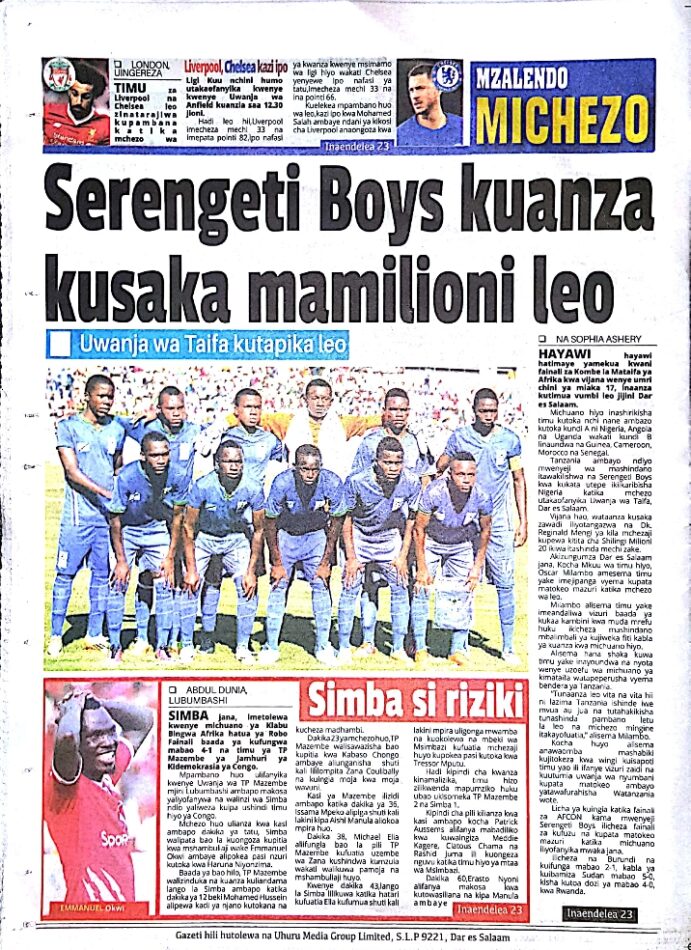 MAGAZETI YA TANZANIA LEO JUMAPILI, APRILI 14, 2019 Global Publishers April 14, 2019 SHARE THIS: Hapa tumekuanikia kurasa za mbele na za nyuma za magazeti yote ya Tanzania leo APRILI 14, 2019. Ni yale ya Hardnews, Udaku na Michezo. Usipitwe na Matukio, Install App Yako ya Kijanja na Namba Moja Tanzania ya Global Publishers Android ===> GooglePlay iOS ===> AppStore SHARE THIS: