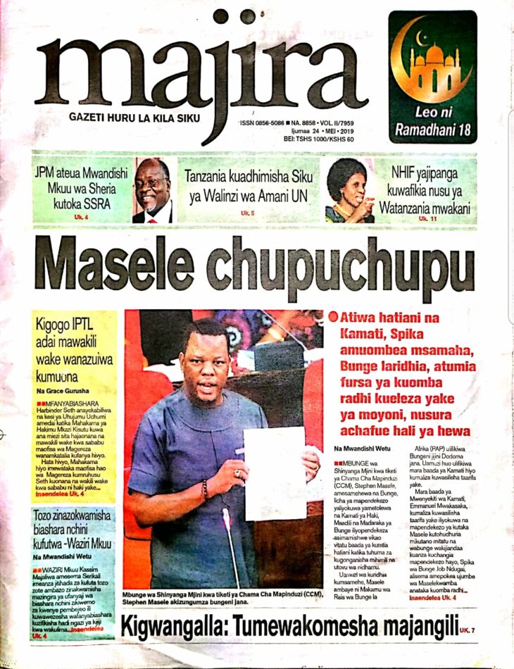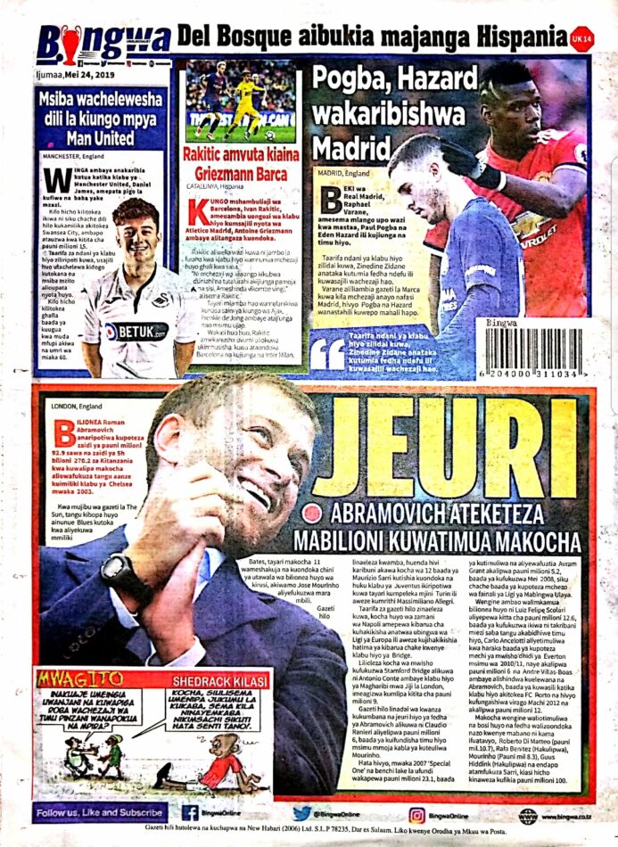 MAGAZETI YA TANZANIA LEO IJUMAA, MEI 24, 2019 Global Publishers May 24, 2019 SHARE THIS: Hapa tumekuanikia kurasa za mbele na za nyuma za magazeti yote ya Tanzania leo MEI 24, 2019. Ni yale ya Hardnews, Udaku na Michezo. Usipitwe na Matukio, Install App Yako ya Kijanja na Namba Moja Tanzania ya Global Publishers Android ===> GooglePlay iOS ===> AppStore SHARE THIS:
