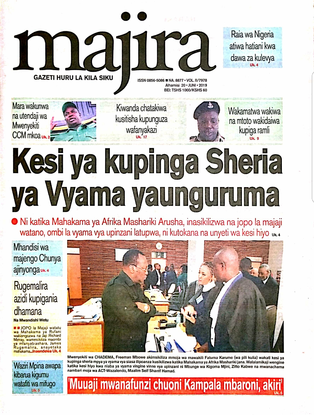 MAGAZETI YA TANZANIA LEO ALHAMISI, JUNI 20, 2019 Global Publishers June 20, 2019 SHARE THIS: Hapa tumekuanikia kurasa za mbele na za nyuma za magazeti yote ya Tanzania leo JUNI 20, 2019. Ni yale ya Hardnews, Udaku na Michezo. Usipitwe na Matukio, Install App Yako ya Kijanja na Namba Moja Tanzania ya Global Publishers Android ===> GooglePlay iOS ===> AppStore SHARE THIS:
