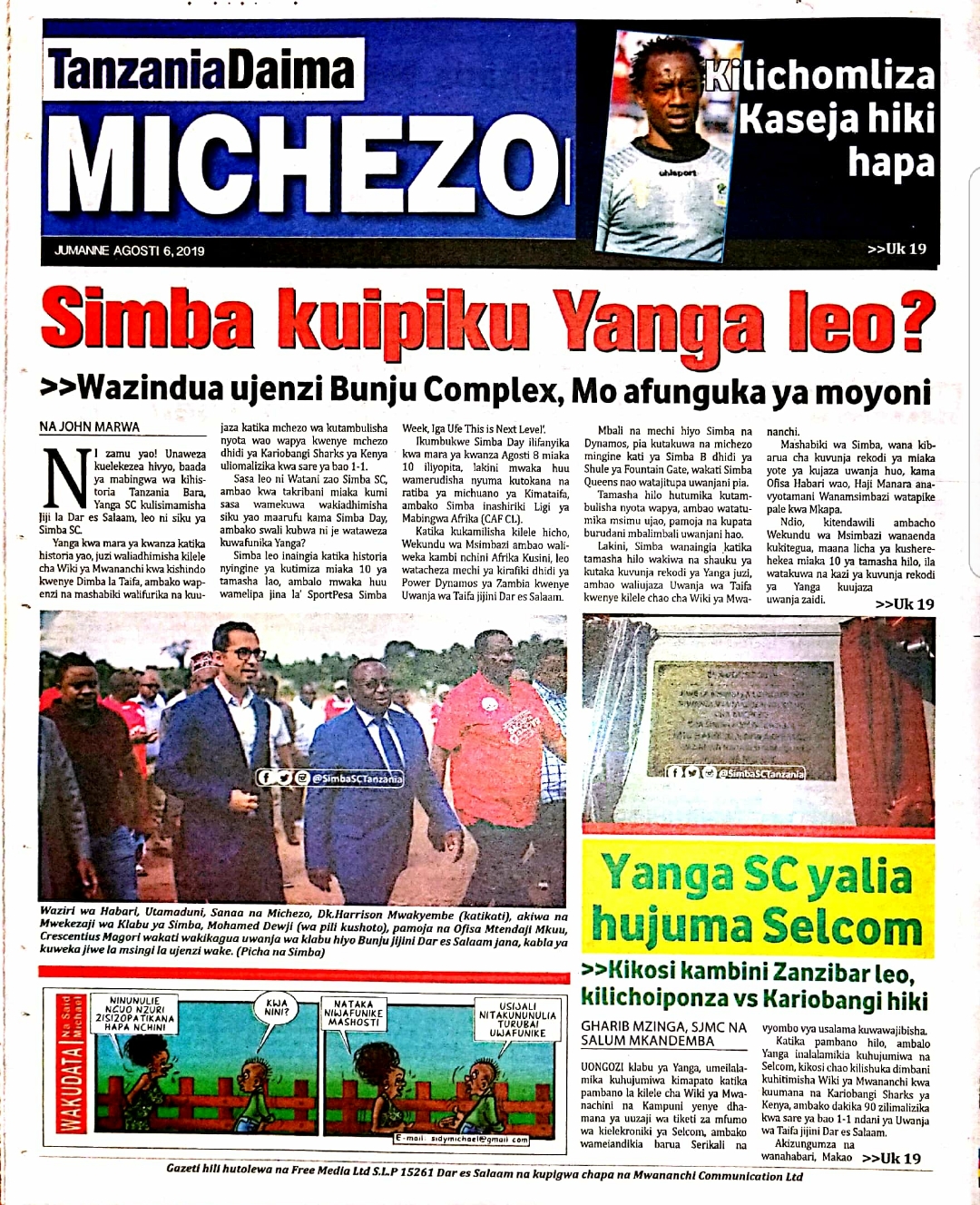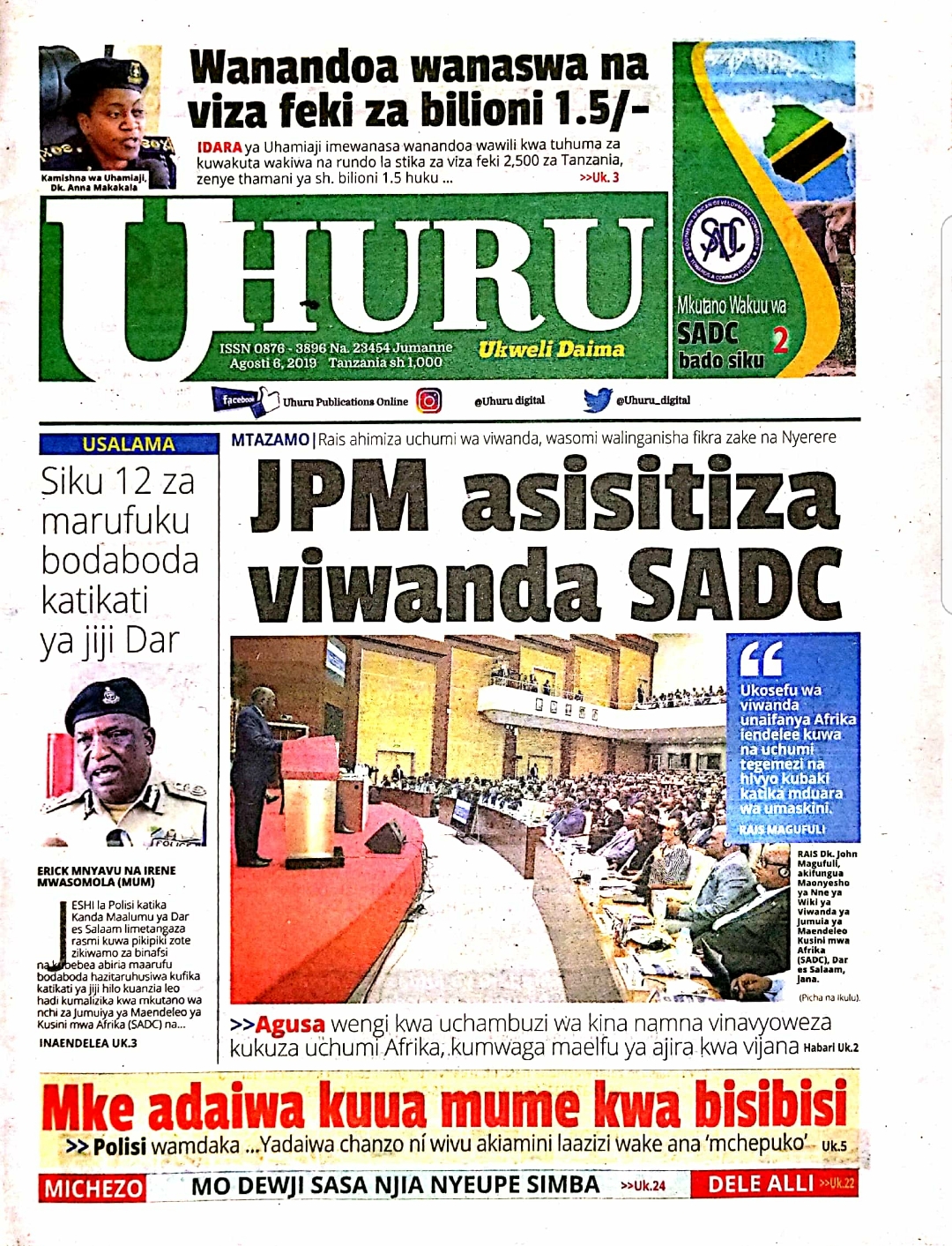MAGAZETI YA TANZANIA LEO JUMANNE, AGOSTI 6, 2019 Global Publishers August 6, 2019 SHARE THIS: Hapa tumekuanikia kurasa za mbele na za nyuma za magazeti yote ya Tanzania leo Agosti 6, 2019. Ni yale ya Hardnews, Udaku na Michezo. Usipitwe na Matukio, Install App Yako ya Kijanja na Namba Moja Tanzania ya Global Publishers Android ===> GooglePlay iOS ===> AppStore SHARE THIS: