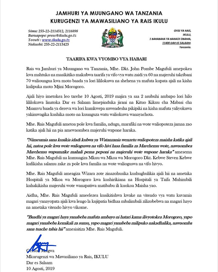 Rais Magufuli amepokea kwa mshtuko na masikitiko makubwa taarifa ya vifo vya watu zaidi ya 60 na majeruhi takribani 70 walioungua kwa moto baada ya lori lililokuwa na shehena ya mafuta kupata ajali na kisha kulipuka moto Mjini Morogoro.