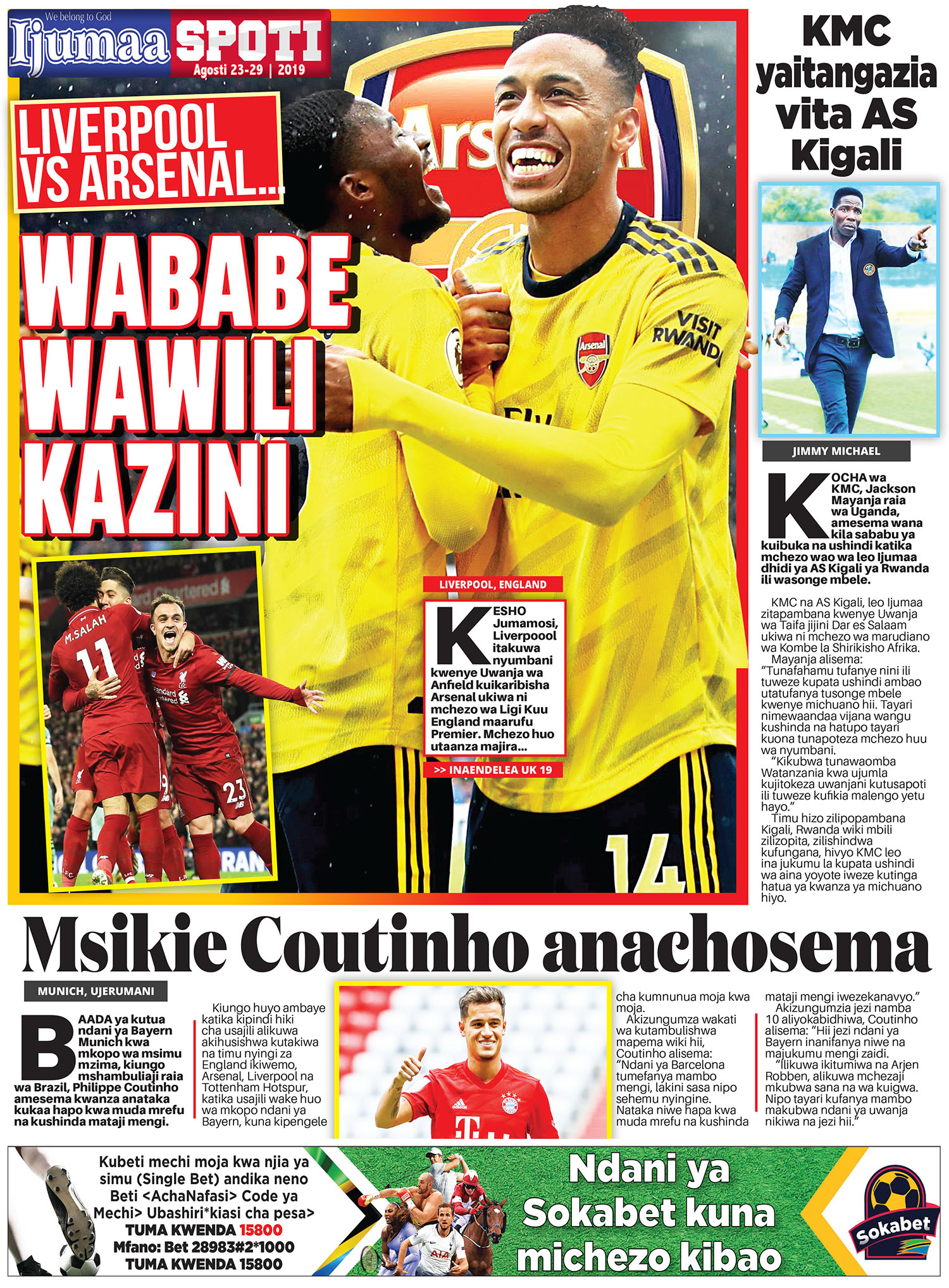 Magazeti ya Tanzania Leo Ijumaa, Agosti 23, 2019 Global Publishers August 23, 2019 SHARE THIS: Hapa tumekuanikia kurasa za mbele na za nyuma za magazeti yote ya Tanzania leo Agosti 23, 2019. Ni yale ya Hardnews, Udaku na Michezo. Usipitwe na Matukio, Install App Yako ya Kijanja na Namba Moja Tanzania ya Global Publishers Android ===> GooglePlay iOS ===> AppStore SHARE THIS: