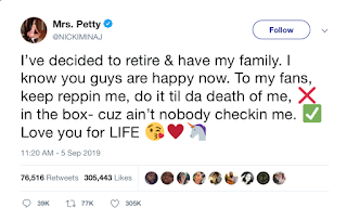 Rapper wa kike kutokea Marekani, Onika Tanya Maraj maarufu kama Nick Minaj jana Septemba 5, 2019, ameutangazia umma kustaafu kazi ya muziki.
