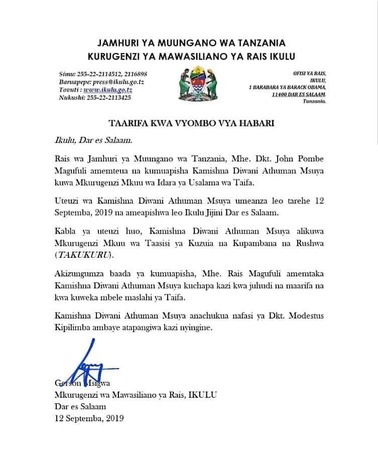 Taarifa iliyotolewa leo Alhamisi Septemba 12, 2019 na Mkurugenzi wa Mawasiliano ya Rais Ikulu, Gerson Msigwa inaeleza kuwa uteuzi wake umeanza leo.
