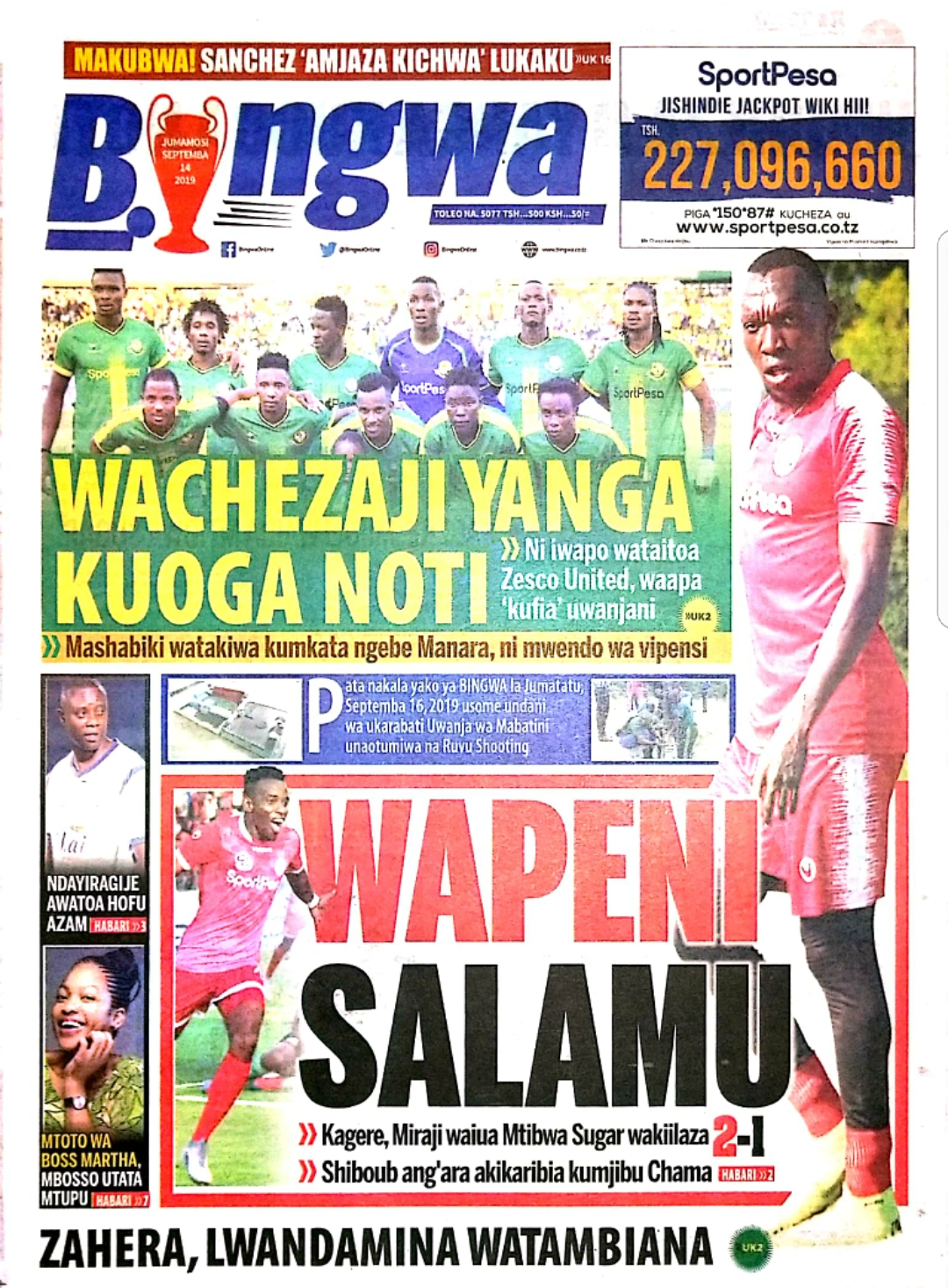 Magazeti ya Tanzania Leo Jumamosi, Septemba 14, 2019 Global Publishers September 14, 2019 SHARE THIS: Hapa tumekuanikia kurasa za mbele na za nyuma za magazeti yote ya Tanzania leo Agosti 14, 2019. Ni yale ya Hardnews, Udaku na Michezo. Usipitwe na Matukio, Install App Yako ya Kijanja na Namba Moja Tanzania ya Global Publishers Android ===> GooglePlay iOS ===> AppStore SHARE THIS: