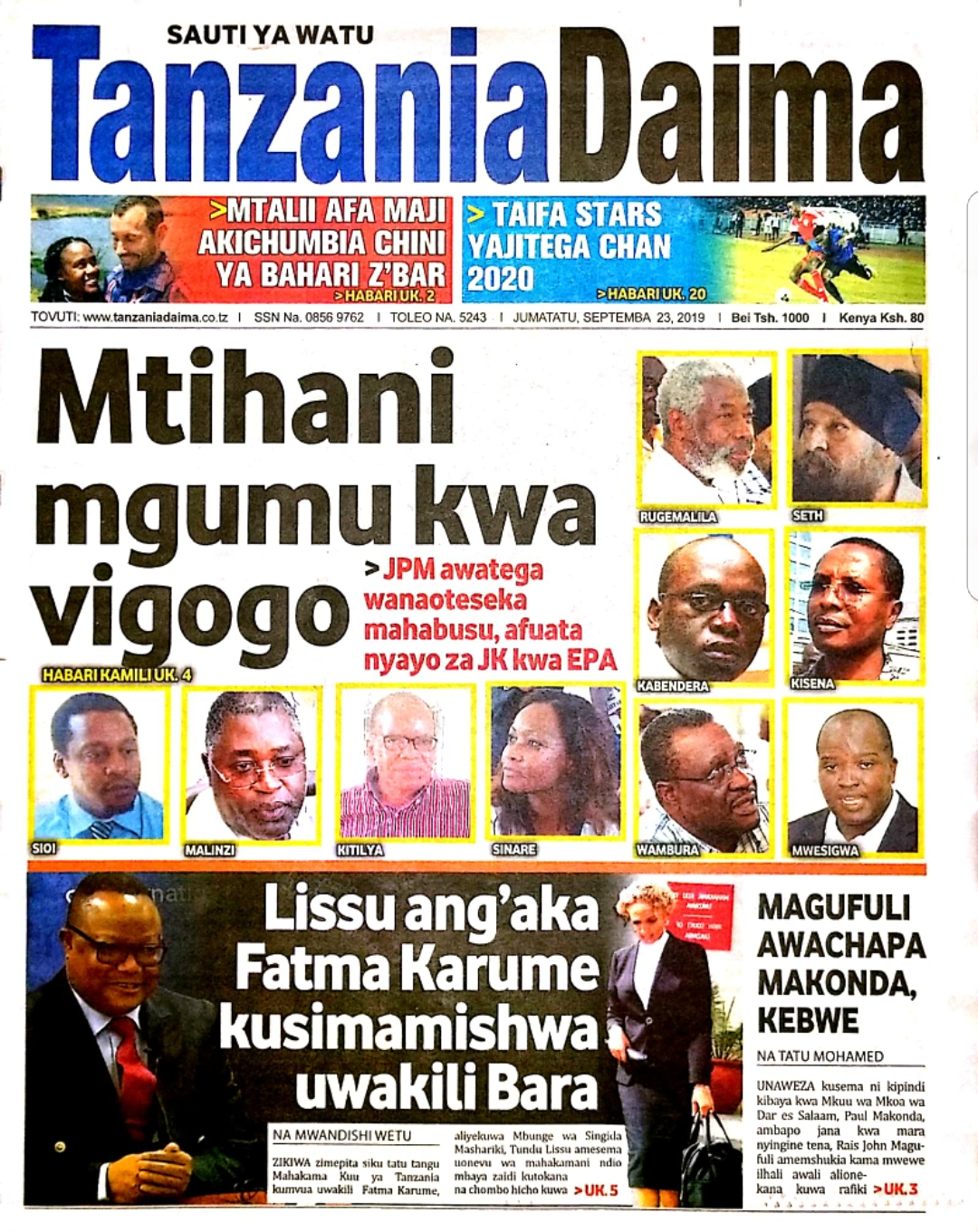 Magazeti ya Tanzania Leo Jumatatu, Septemba 23, 2019 Global Publishers September 23, 2019 SHARE THIS: Hapa tumekuanikia kurasa za mbele na za nyuma za magazeti yote ya Tanzania leo Septemba 23, 2019. Ni yale ya Hardnews, Udaku na Michezo. Usipitwe na Matukio, Install App Yako ya Kijanja na Namba Moja Tanzania ya Global Publishers Android ===> GooglePlay iOS ===> AppStore SHARE THIS: