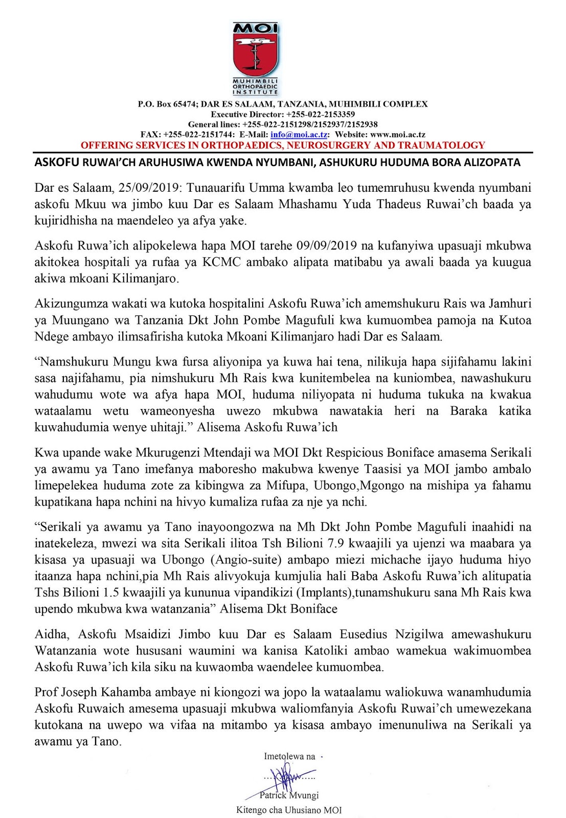 Askofu Mkuu jimbo Katoriki la Dar es Salaam, baba Mwashamu, Yudatadei Ruwai’ch ameruhusiwa katika Taasisi ya Mifupa (MOI) alipokuwa akipatiwa matibabu.
