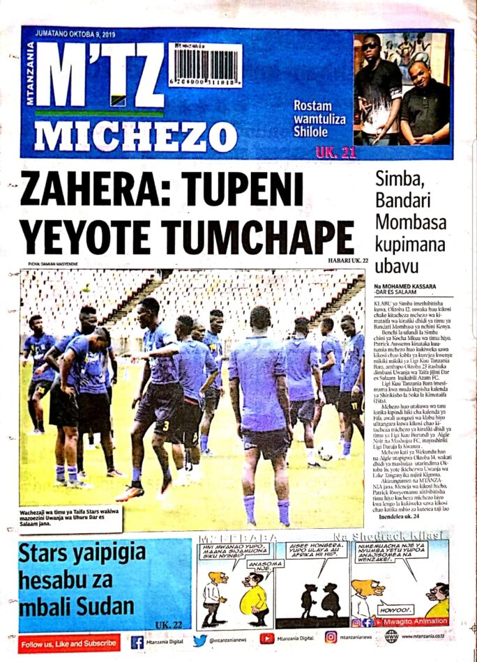 Magazeti ya Tanzania Leo Jumatano, Oktoba 09, 2019 Global Publishers October 9, 2019 SHARE THIS: Hapa tumekuanikia kurasa za mbele na za nyuma za magazeti yote ya Tanzania leo Oktoba 09, 2019. Ni yale ya Hardnews, Udaku na Michezo. Usipitwe na Matukio, Install App Yako ya Kijanja na Namba Moja Tanzania ya Global Publishers Android ===> GooglePlay iOS ===> AppStore SHARE THIS: