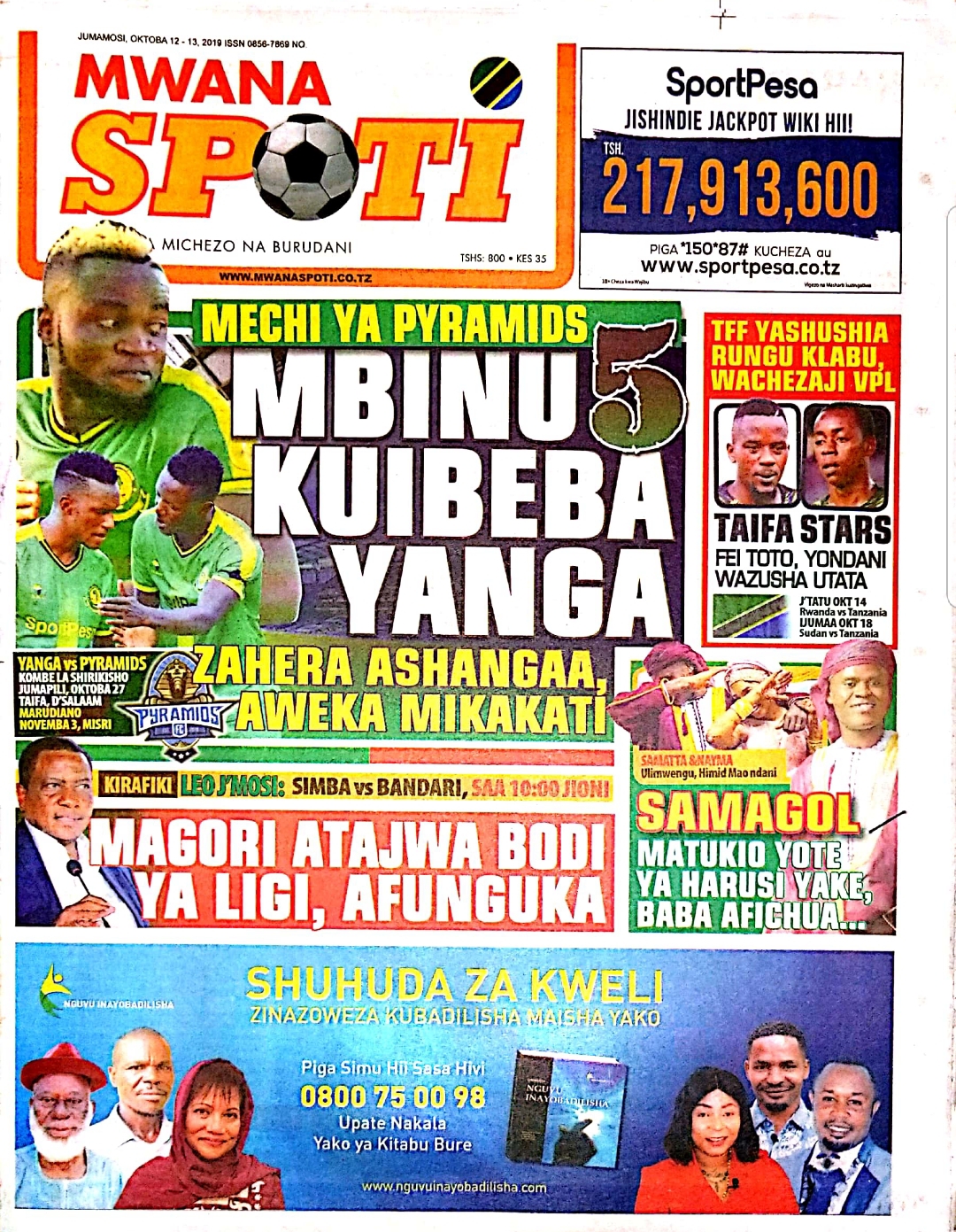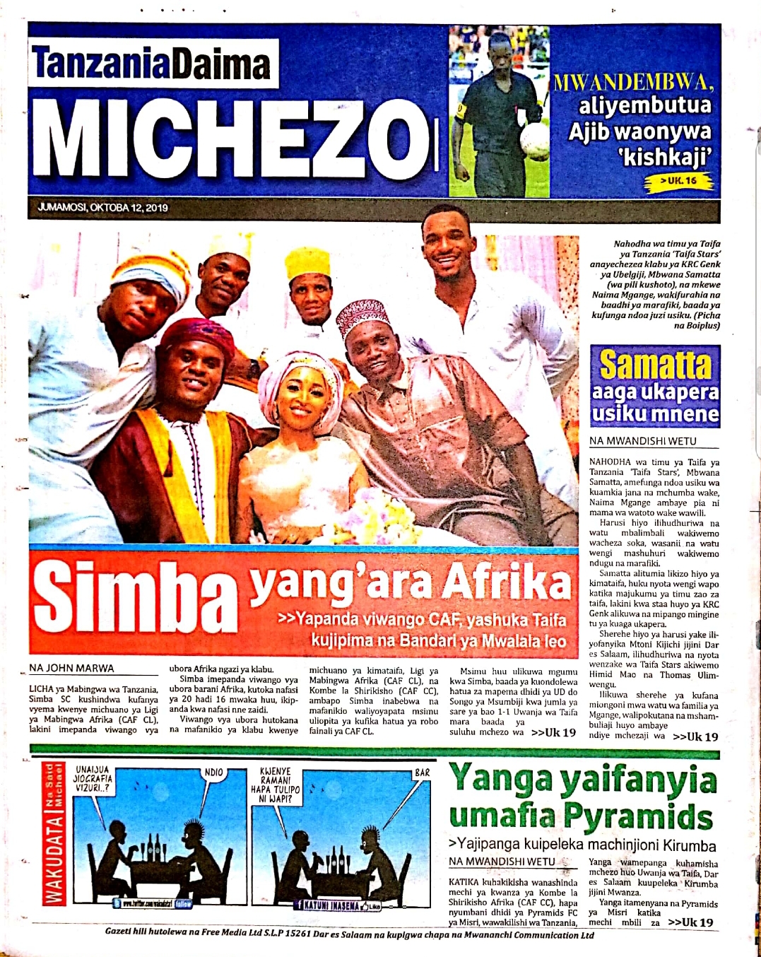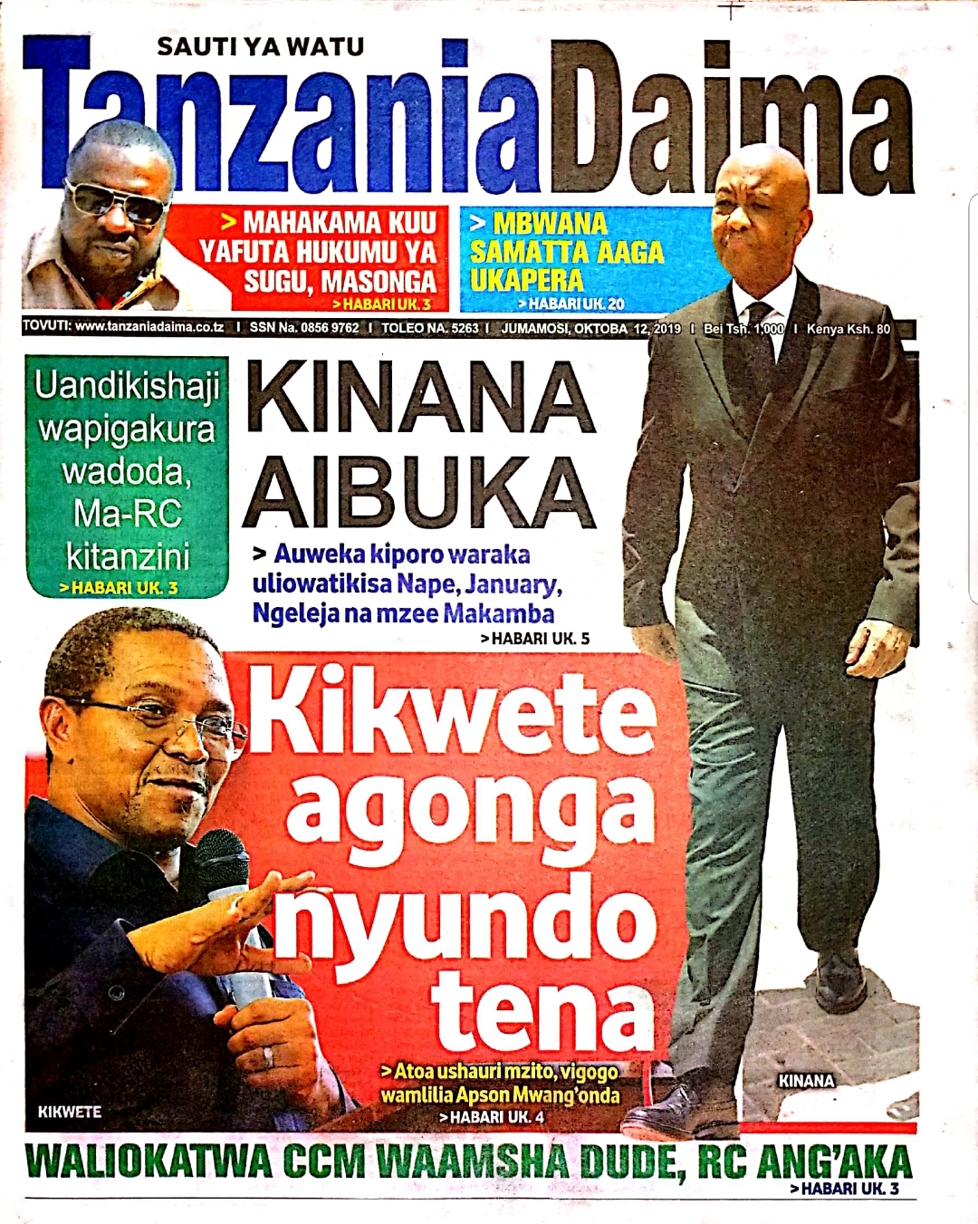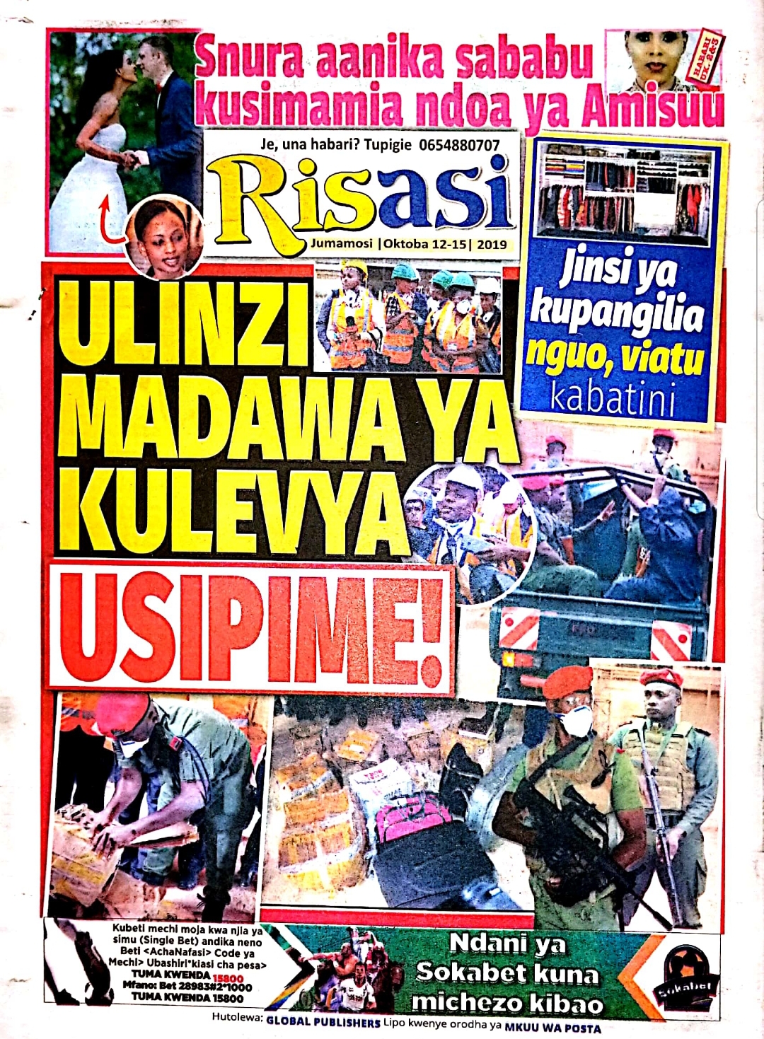 Magazeti ya Tanzania Leo Jumamosi, Oktoba 12, 2019 Global Publishers October 12, 2019 SHARE THIS: Hapa tumekuanikia kurasa za mbele na za nyuma za magazeti yote ya Tanzania leo Oktoba 12, 2019. Ni yale ya Hardnews, Udaku na Michezo. Usipitwe na Matukio, Install App Yako ya Kijanja na Namba Moja Tanzania ya Global Publishers Android ===> GooglePlay iOS ===> AppStore SHARE THIS: