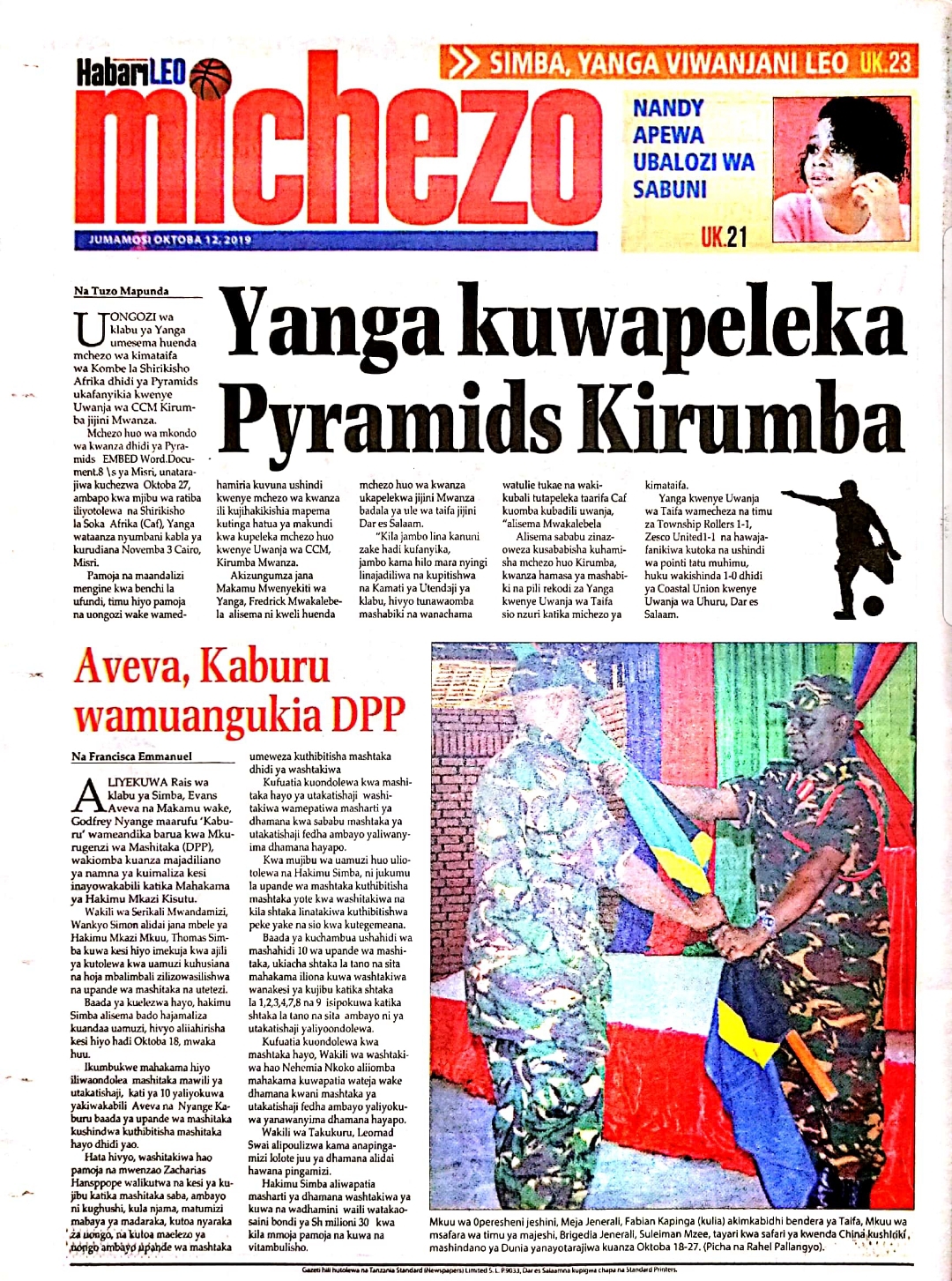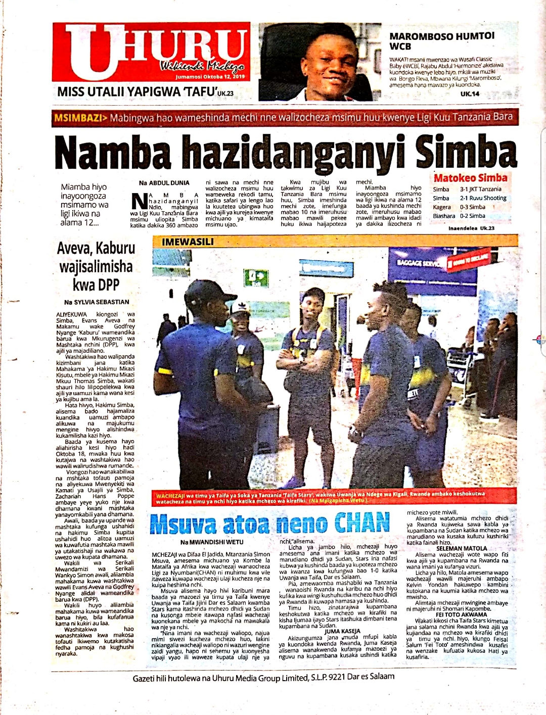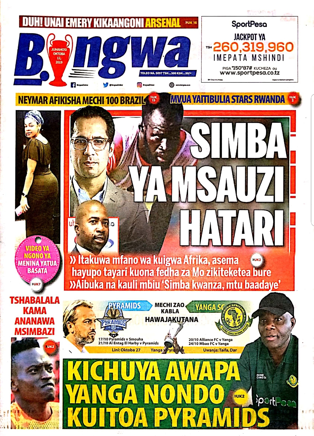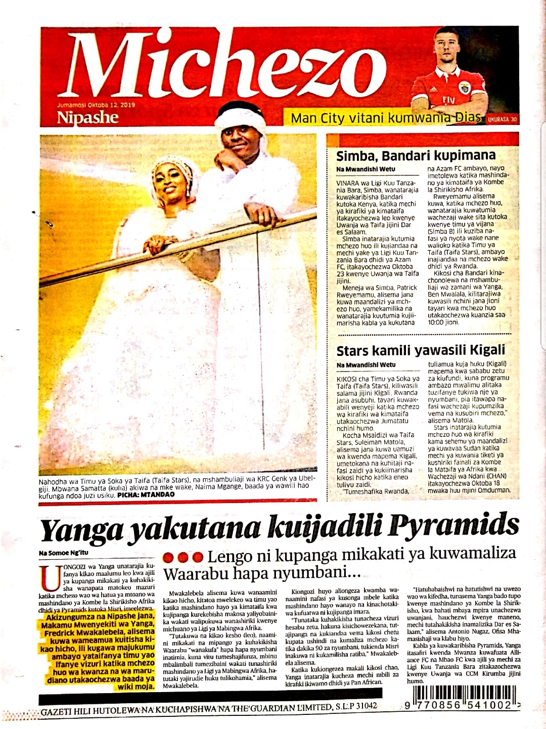 Magazeti ya Tanzania Leo Jumamosi, Oktoba 12, 2019 Global Publishers October 12, 2019 SHARE THIS: Hapa tumekuanikia kurasa za mbele na za nyuma za magazeti yote ya Tanzania leo Oktoba 12, 2019. Ni yale ya Hardnews, Udaku na Michezo. Usipitwe na Matukio, Install App Yako ya Kijanja na Namba Moja Tanzania ya Global Publishers Android ===> GooglePlay iOS ===> AppStore SHARE THIS: