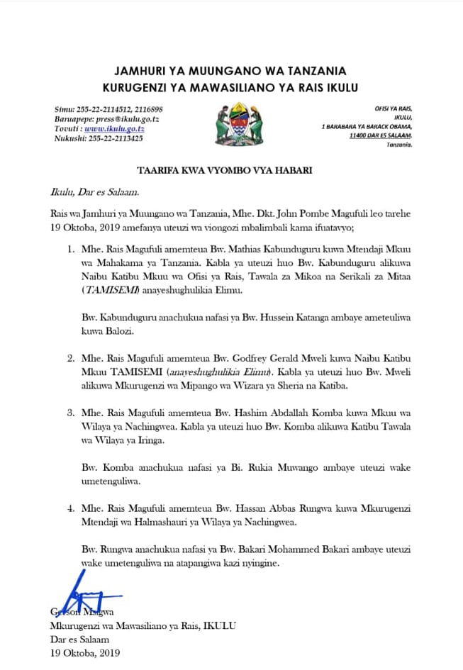 Leo Jumamosi Oktoba 19, 2019 Rais Dkt. John Magufuli amefanya Uteuzi wa Viongozi mbalimbali ambapo ametengua uteuzi wa Mkuu wa Wilaya ya Nachingwea, Bi. Rukia Muwango na nafasi yake imechukuliwa na Bw. Hashim Abdallah Komba.